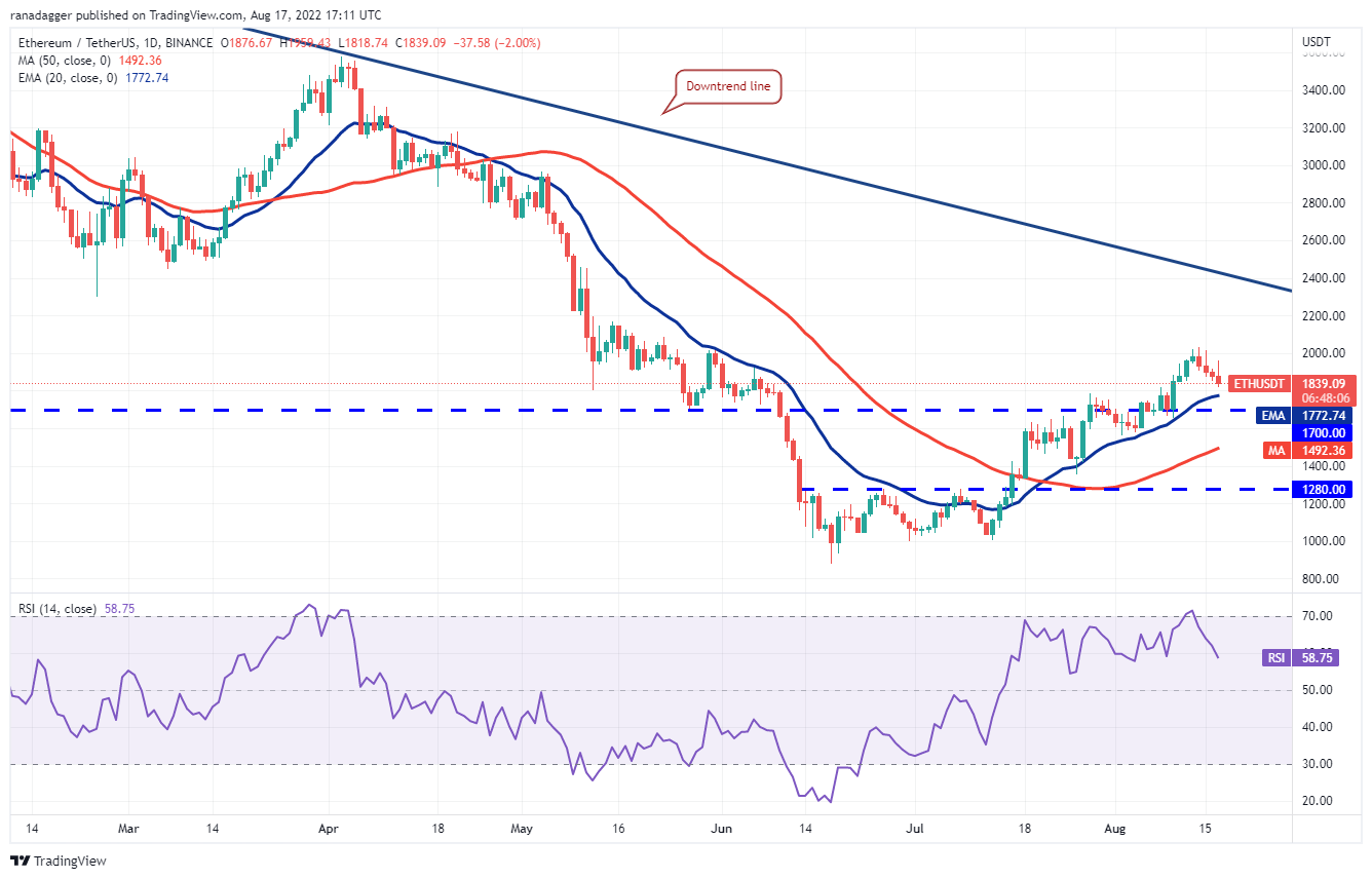 Ether (ETH) subió desde USD 1,853 el 16 de agosto y los alcistas intentaron subir el precio por encima de USD 2,000 el 17 de agosto. Sin embargo, la mecha larga en la vela del día sugiere que los comerciantes pueden estar aligerando posiciones en los repuntes.