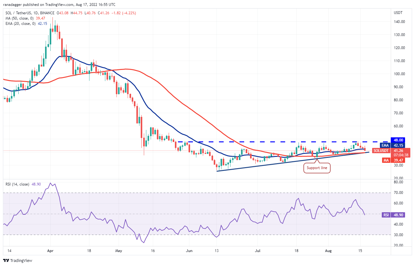 Los bajistas intentarán hundir el precio por debajo de la línea de soporte. Si logran hacer eso, invalidará el patrón de triángulo ascendente alcista en desarrollo. El par SOL/USDT podría entonces caer a USD 37.50 y luego a USD 34.50.