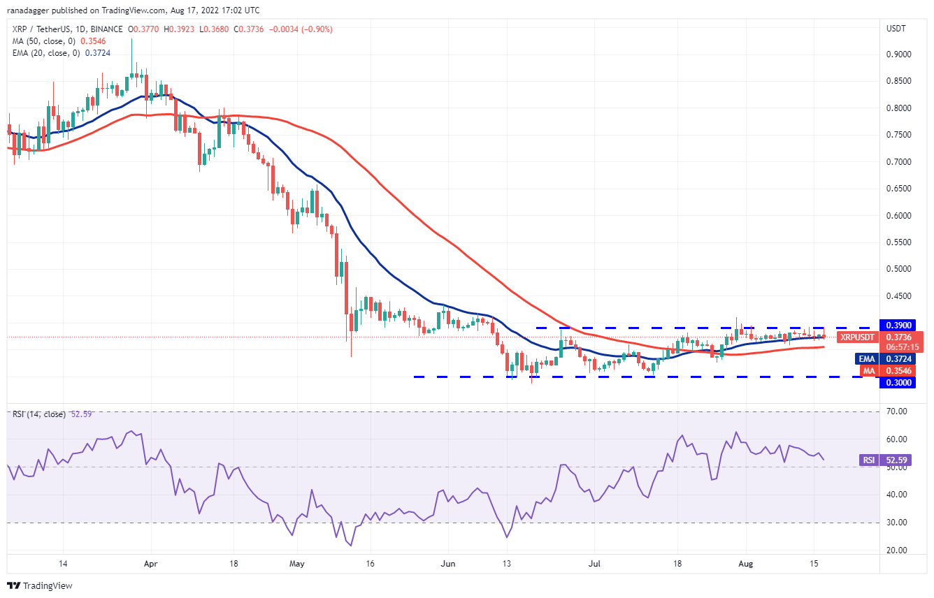 Los alcistas defendieron con éxito la zona entre los promedios móviles e intentaron empujar a XRP por encima de la resistencia superior a USD 0.39 el 17 de agosto. La mecha larga en la vela del día muestra que los bajistas no están dispuestos a rendirse y continúan defendiendo la resistencia superior con vigor.