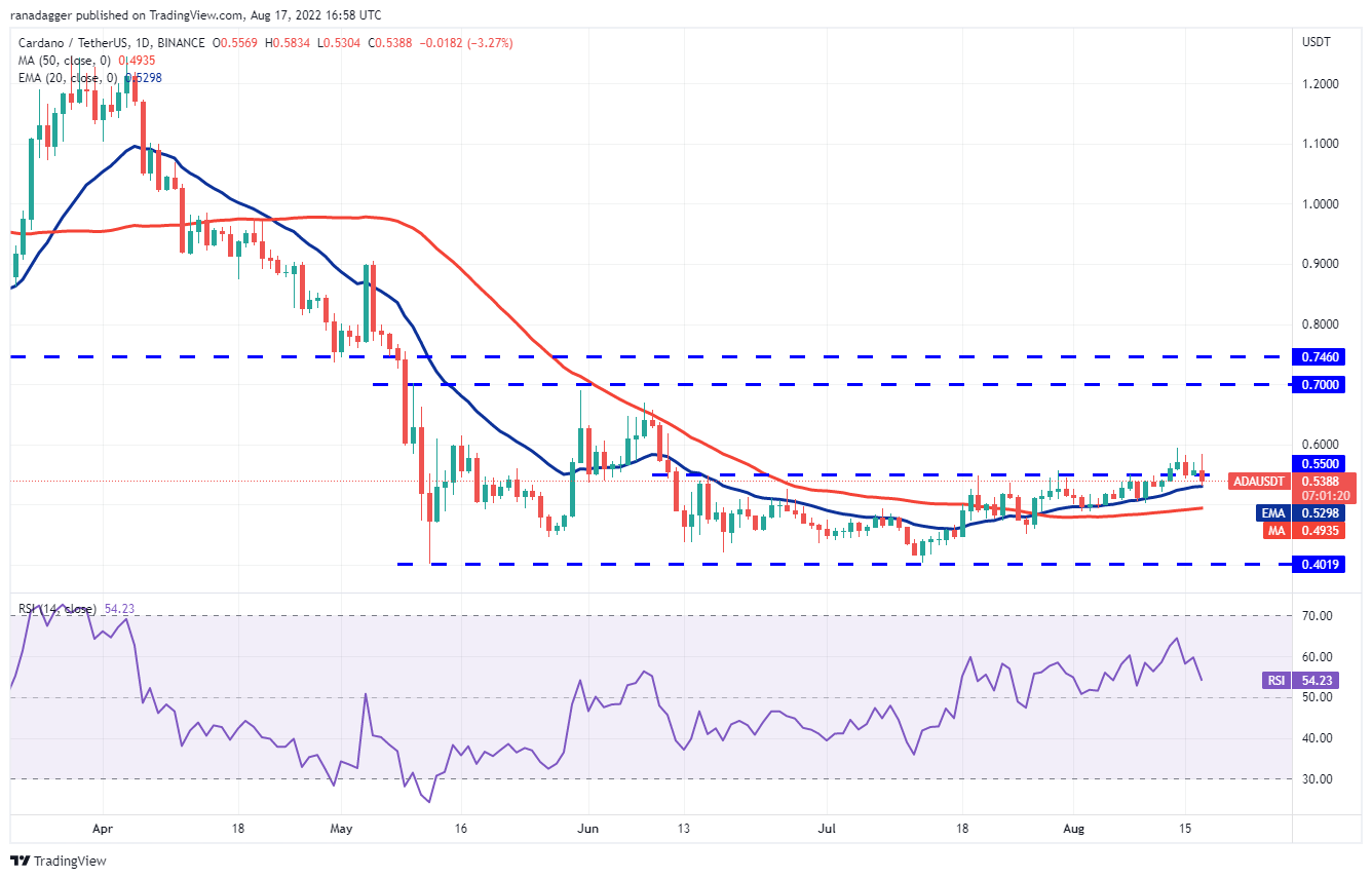 Cardano (ADA) rebotó en el nivel de ruptura de USD 0.55 el 16 de agosto, pero los bajistas continúan planteando un fuerte desafío en los niveles más altos, como se ve desde la mecha larga de la vela del 17 de agosto.