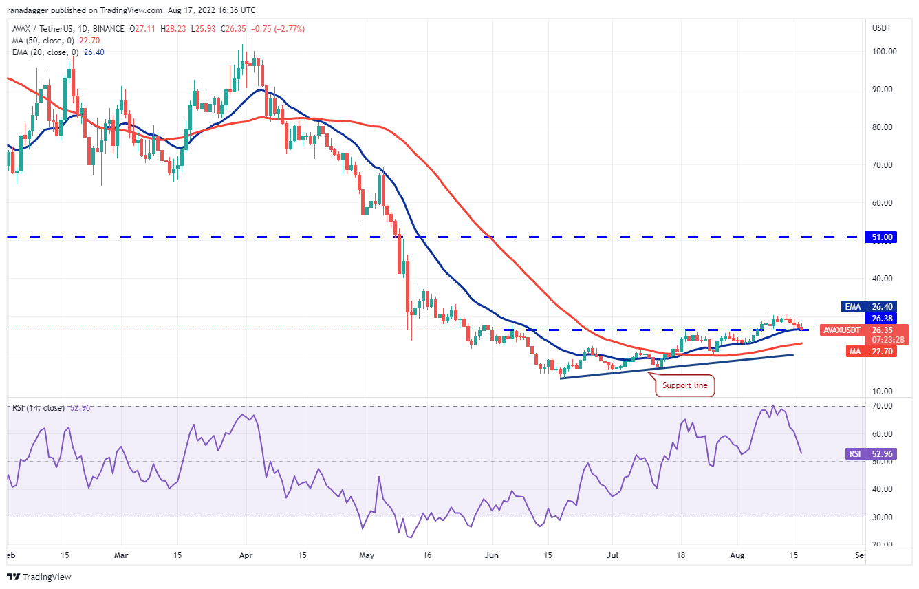 Avalanche (AVAX) continúa deslizándose hacia el nivel de ruptura de USD 26.38. Es probable que los alcistas compren la caída e intenten convertir este nivel en soporte.