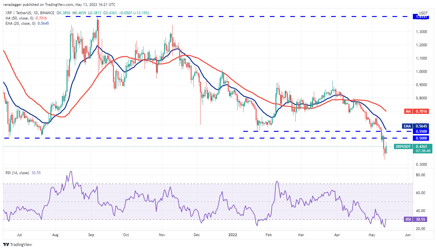 Ripple (XRP) cayó en picado hasta los USD 0.33 el 12 de mayo, donde surgieron las compras. Los alcistas están intentando una recuperación que probablemente se enfrente a una dura resistencia en el nivel psicológico de USD 0.50.