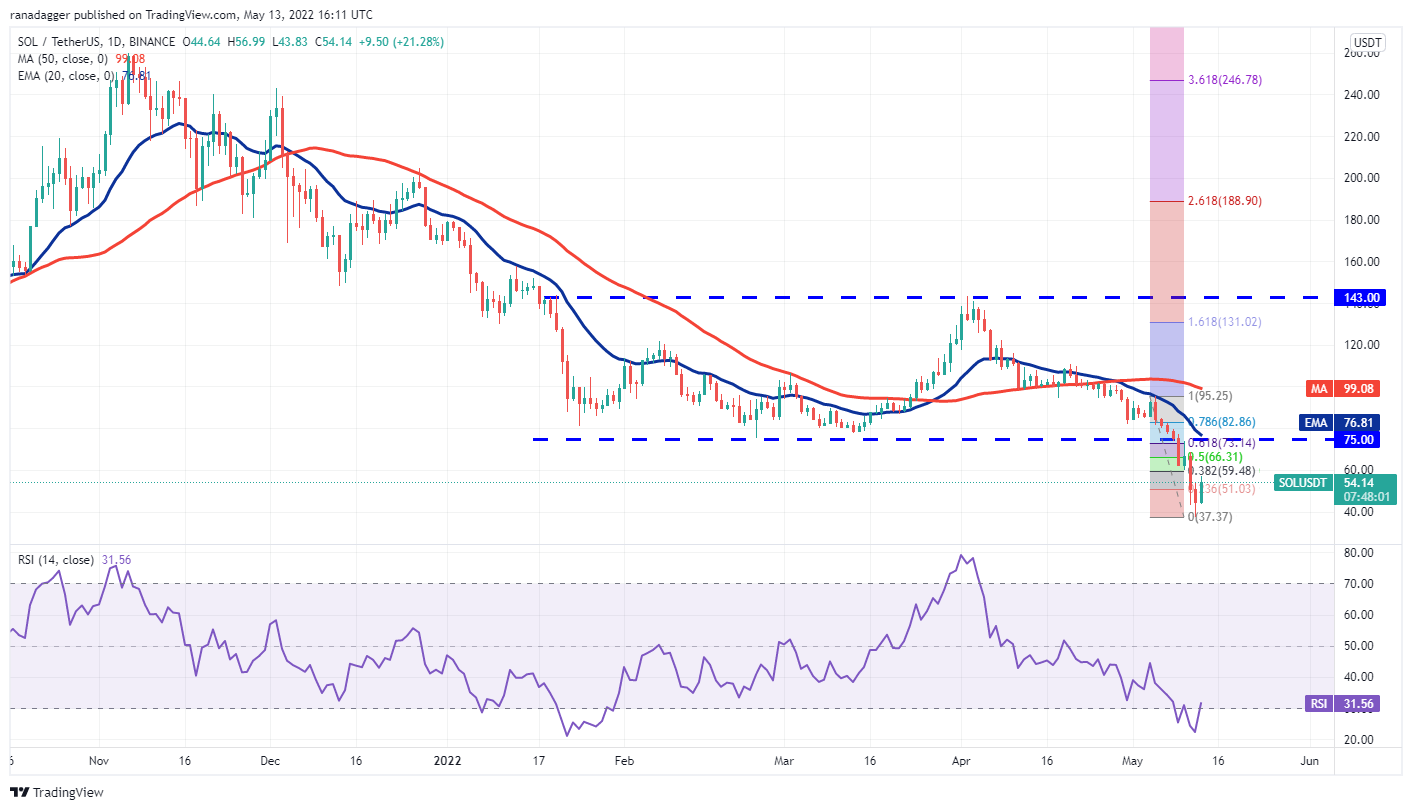 Es probable que los alcistas se encuentren con ventas en la zona comprendida entre el nivel de retroceso del 38.2% de Fibonacci, situado en USD 59, y el nivel de retroceso del 50%, situado en USD 66. Si el precio sale de esta zona, los bajistas intentarán reanudar la tendencia bajista tirando del par por debajo de los USD 37. Si lo consiguen, el par SOL/USDT podría caer hasta los USD 32.