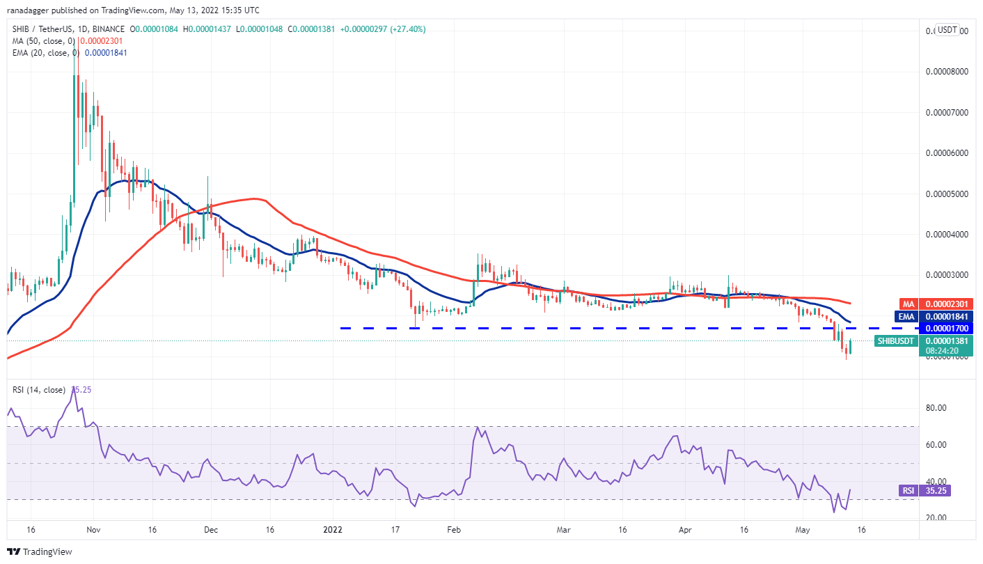 Shiba Inu (SHIB) se desplomó por debajo del nivel psicológico de USD 0.000010 el 12 de mayo, pero la larga cola de la vela del día sugiere la compra en niveles inferiores. Esto dio lugar a una recuperación el 13 de mayo.