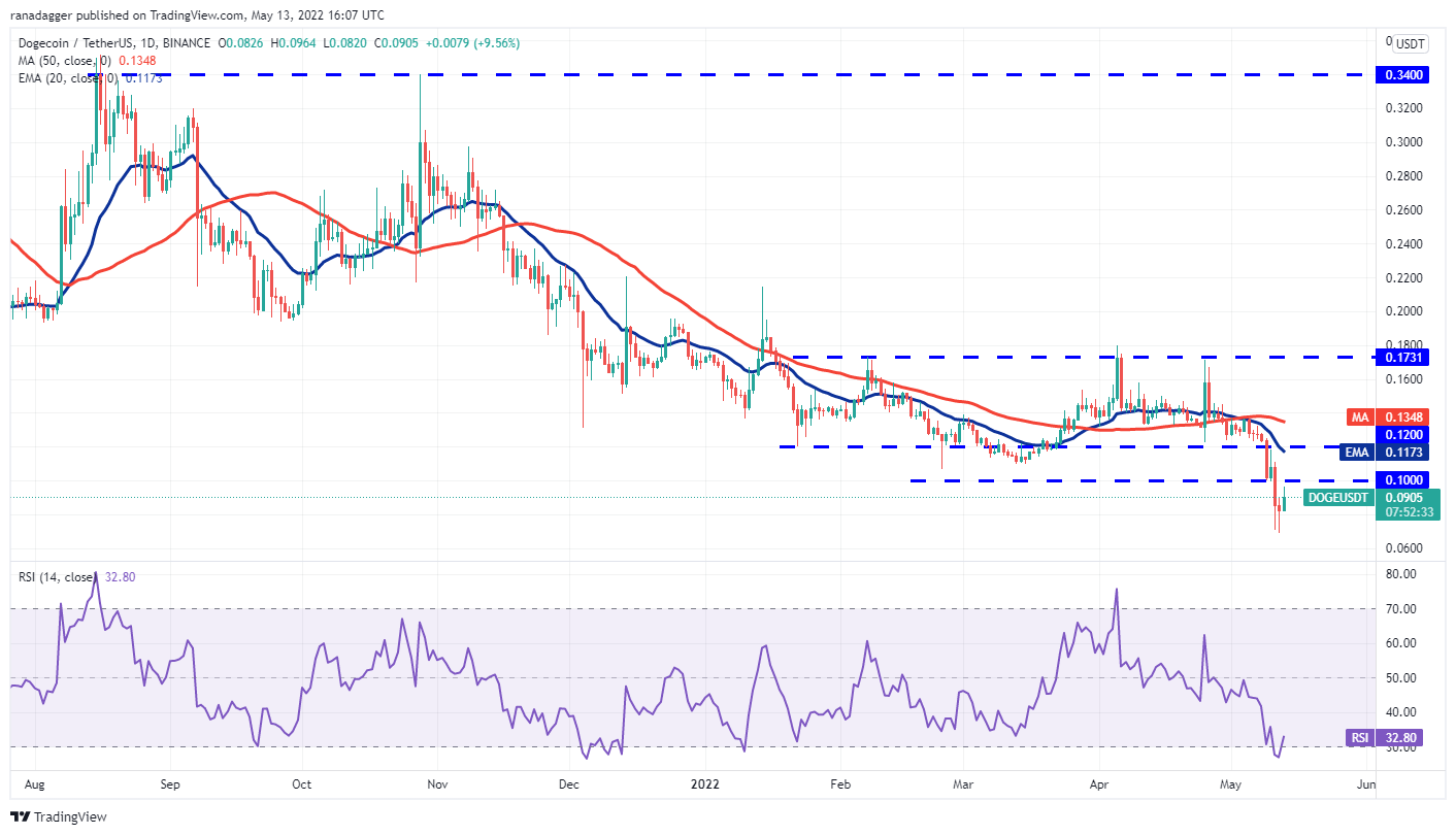 Dogecoin (DOGE) se desplomó hasta los USD 0.06 el 12 de mayo, pero un pequeño aspecto positivo es que los alcistas compraron esta caída. Esto inició un rally de alivio que alcanzó cerca del nivel de ruptura en USD 0.10.