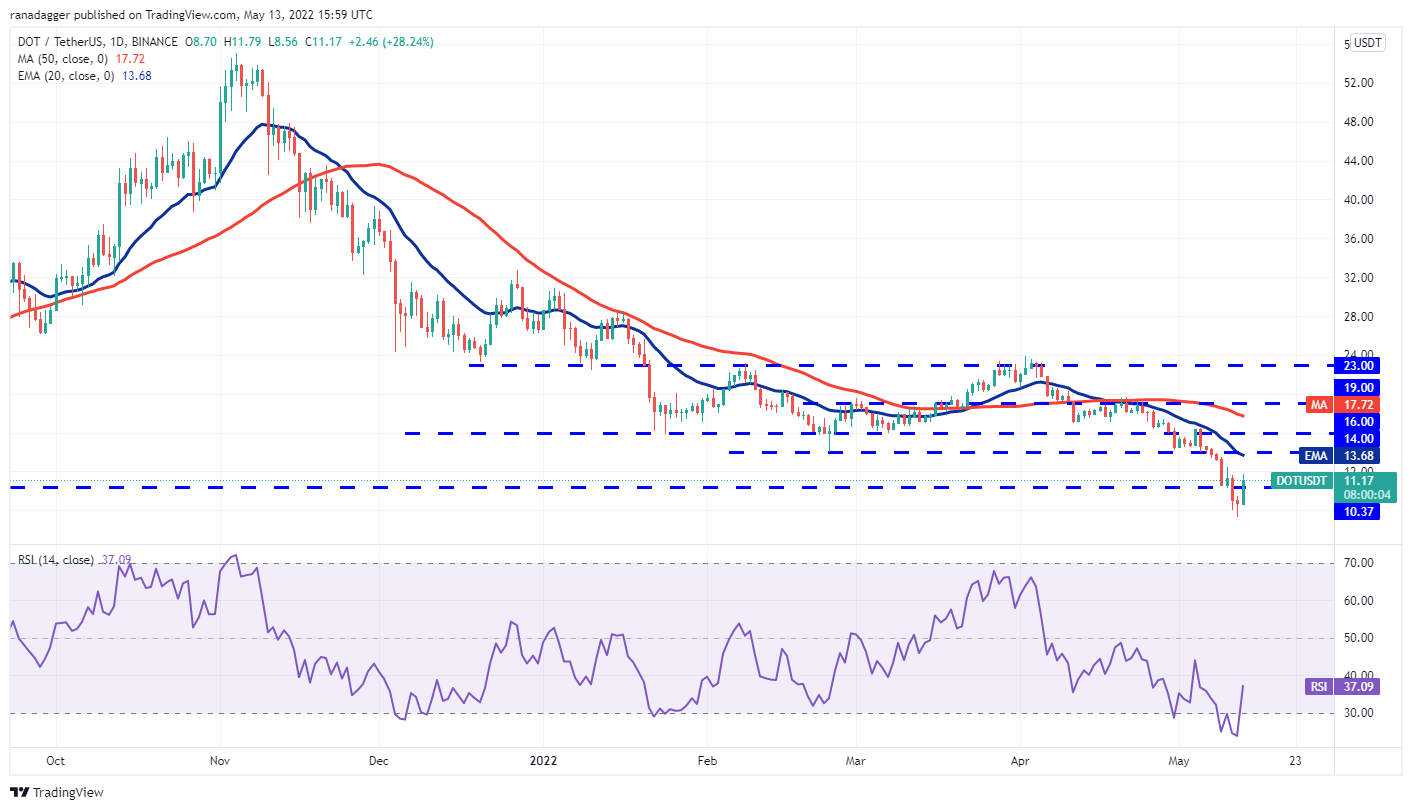 La mecha larga de la vela del 13 de mayo indica que los bajistas están defendiendo agresivamente el nivel de USD 10. Si el precio se gira a la baja desde esta resistencia, los bajistas intentarán reanudar la tendencia bajista llevando al par DOGE/USDT por debajo de USD 0.06. Si lo consiguen, la siguiente parada podría ser USD 0.04.