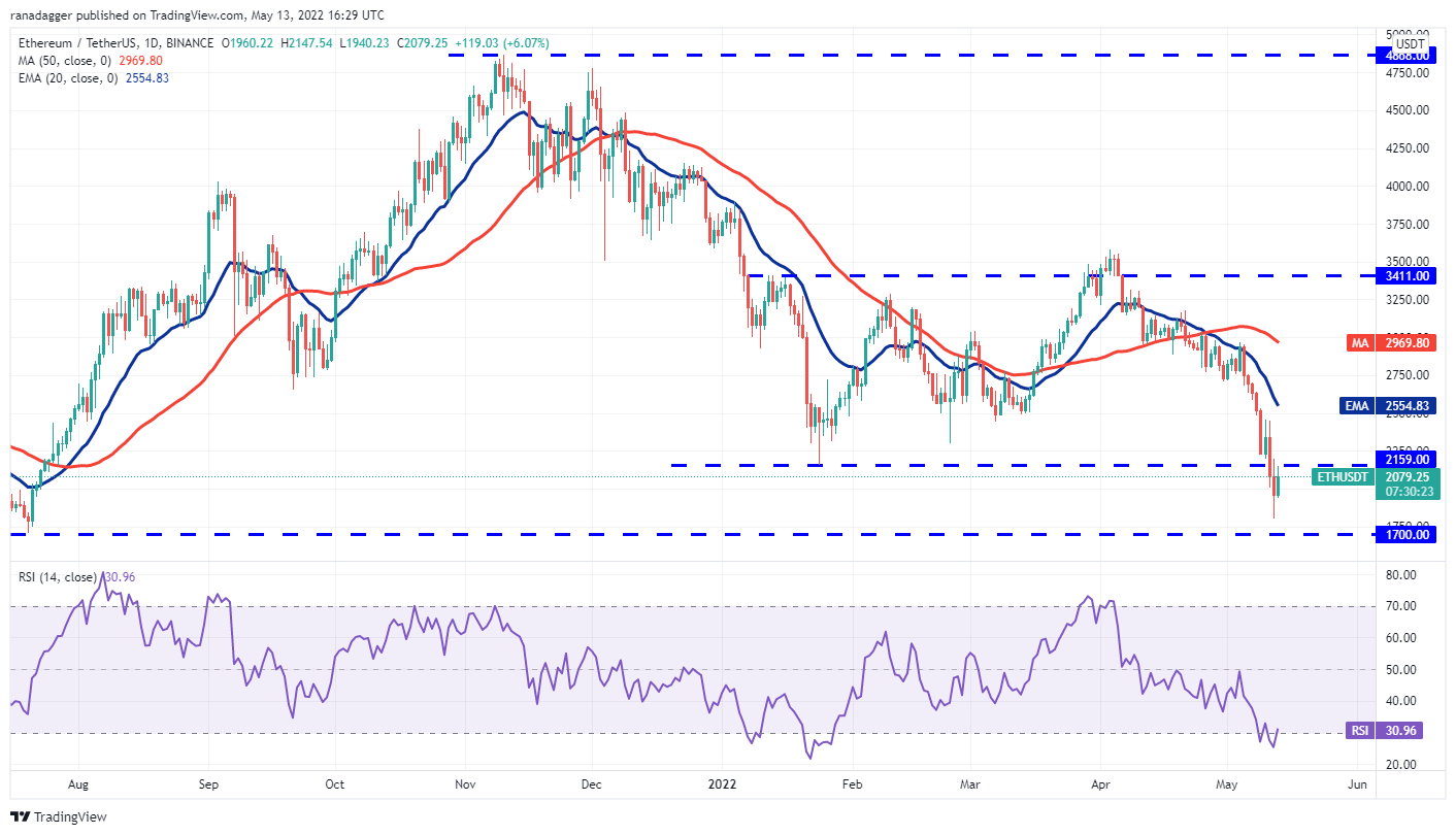 Ether (ETH) rompió por debajo del soporte de USD 2,159 el 11 de mayo y posteriormente se deslizó por debajo del nivel psicológico de USD 2,000 el 12 de mayo. Los alcistas compraron la caída hasta los USD 1,800, lo que ha iniciado un repunte de alivio.