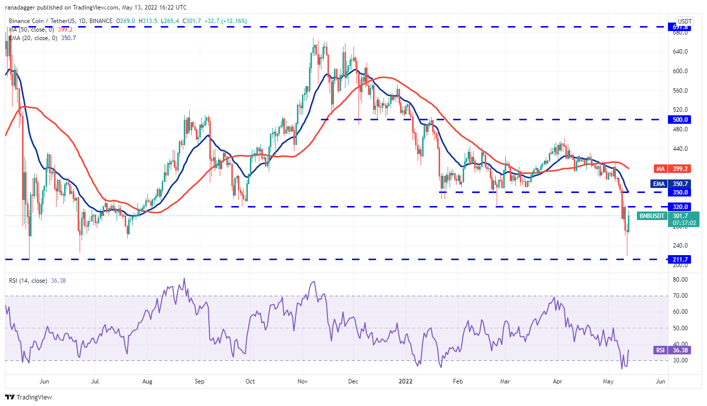 Binance Coin (BNB) cayó fuertemente el 12 de mayo, pero la larga cola de la vela del día muestra que los alcistas defendieron agresivamente el soporte crítico en USD 211. Esto inició un repunte de alivio que ha alcanzado la zona de resistencia de 350 a 320 dólares.
