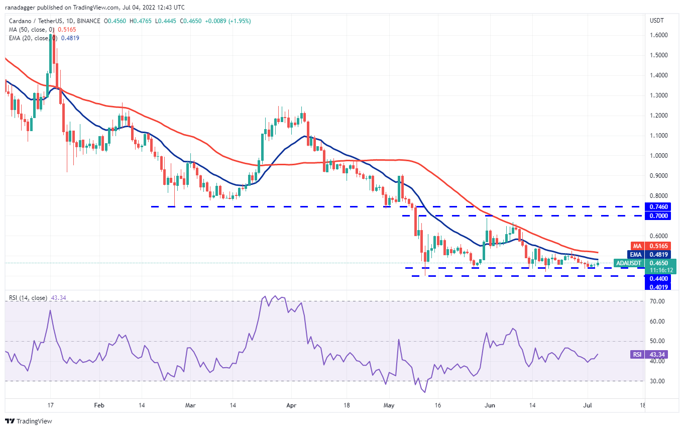 Aunque Cardano (ADA) ha estado cotizando cerca del nivel de USD 0.44 desde el 30 de junio, los bajistas no han sido capaces de tirar y sostener el precio por debajo del soporte. Esto sugiere que los alcistas están comprando las caídas hacia los USD 0.44.