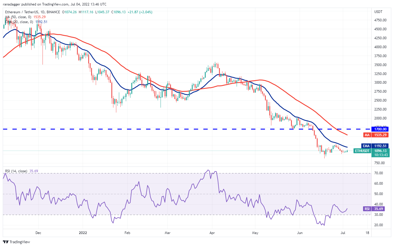 Los alcistas intentarán ahora empujar el precio por encima de la EMA de 20 días (USD 1,192) y ganar la ventaja. Si lo consiguen, el par ETH/USDT podría subir hasta los USD 1,280 y después hasta la EMA de 50 días (USD 1,535). Este nivel podría volver a actuar como una fuerte resistencia. Los alcistas tendrán que impulsar el precio por encima de los USD 1,700 para señalar el inicio de un nuevo movimiento alcista.