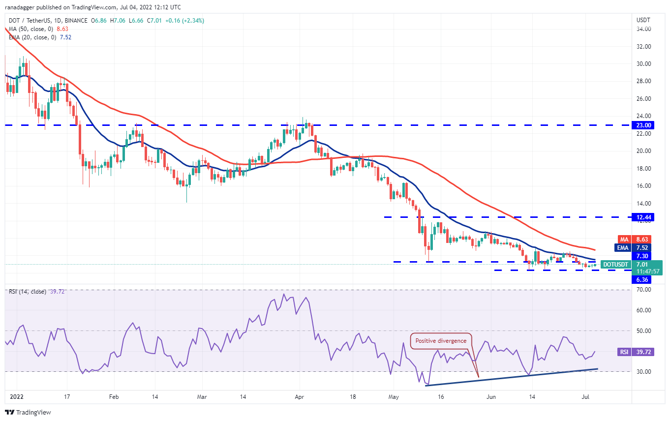 Aunque la EMA de 20 días en descenso (USD 7.52) indica ventaja para los vendedores, la divergencia positiva en el RSI indica que el impulso bajista podría estar debilitándose. Si los compradores impulsan el precio por encima de la EMA de 20 días, el par DOT/USDT podría subir hasta la SMA de 50 días (USD 8.63).