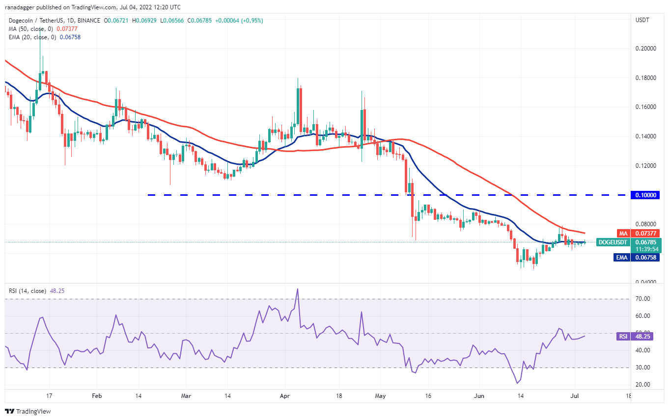 Dogecoin (DOGE) se ha aferrado a la EMA de 20 días (USD 0.07) durante los últimos días. Esto sugiere que los alcistas están comprando las caídas intradía ya que esperan un movimiento más alto.