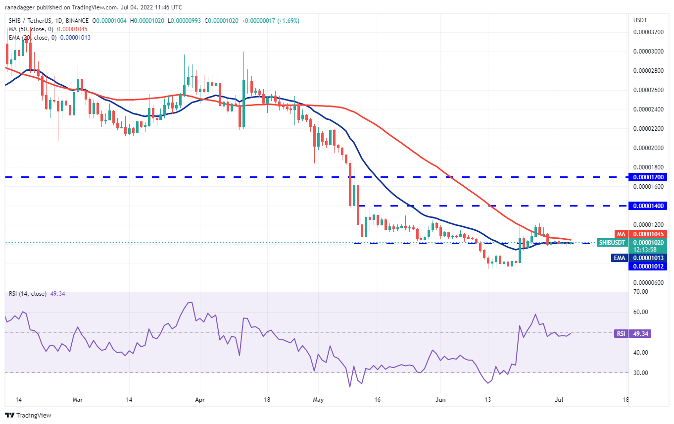 Shiba Inu (SHIB) ha estado cotizando cerca del nivel psicológico de USD 0.000010. Esto sugiere que los alcistas están intentando formar un mínimo mayor cerca de este soporte.