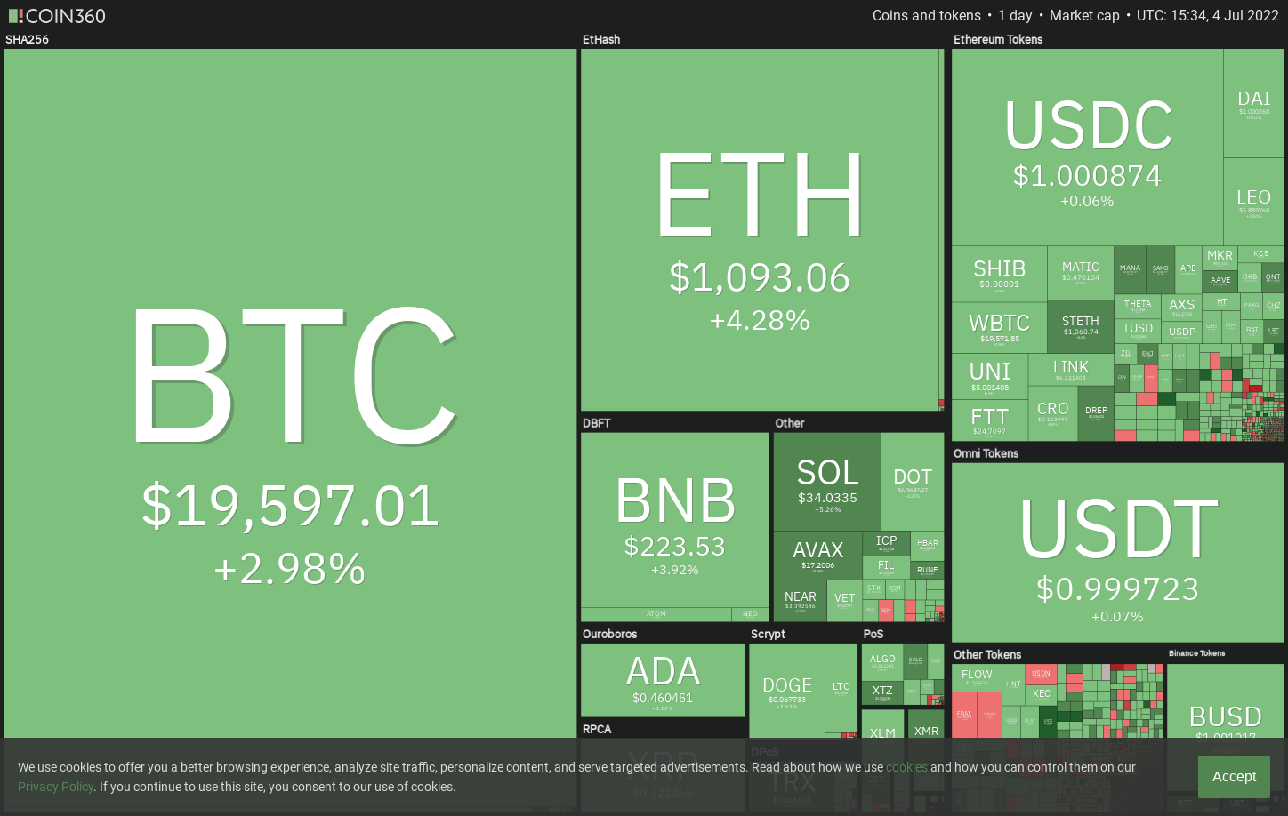 Los criptomercados se han mantenido relativamente estables durante el fin de semana y el 4 de julio, que es feriado para los mercados financieros de Estados Unidos debido al Día de la Independencia. Aunque Arthur Hayes, ex-CEO de la plataforma de derivados BitMEX, esperaba un "mega ventas" alrededor del 4 de julio, no se ha materializado.