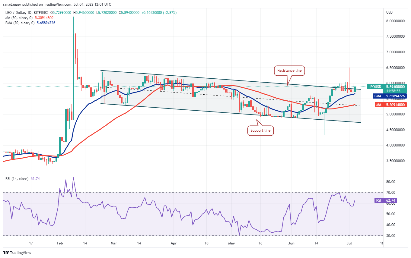 Los alcistas y los bajistas se disputan la supremacía cerca de la línea de resistencia del canal descendente. UNUS SED LEO (LEO) cayó hasta la EMA de 20 días (USD 5.65) el 2 de julio, pero los alcistas defendieron con éxito el nivel.