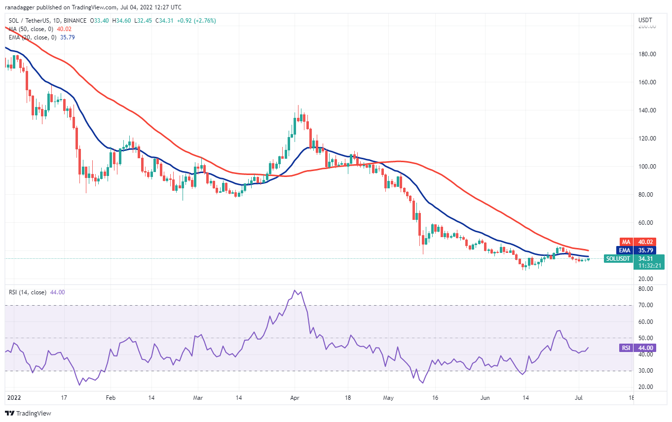Los compradores intentarán ahora empujar el precio por encima de la EMA de 20 días. Si lo consiguen, el par SOL/USDT podría subir hasta la SMA de 50 días (USD 40). Si se rompe y se cierra por encima de esta resistencia, se abrirían las puertas a un posible repunte hasta el nivel psicológico de USD 50.