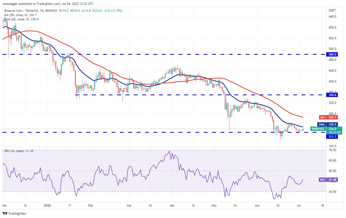 Los compradores han defendido con éxito el soporte de USD 211 desde el 29 de junio, lo que indica una fuerte demanda en los niveles inferiores. Los alcistas intentan actualmente empujar el BNB por encima de la EMA de 20 días (USD 231).