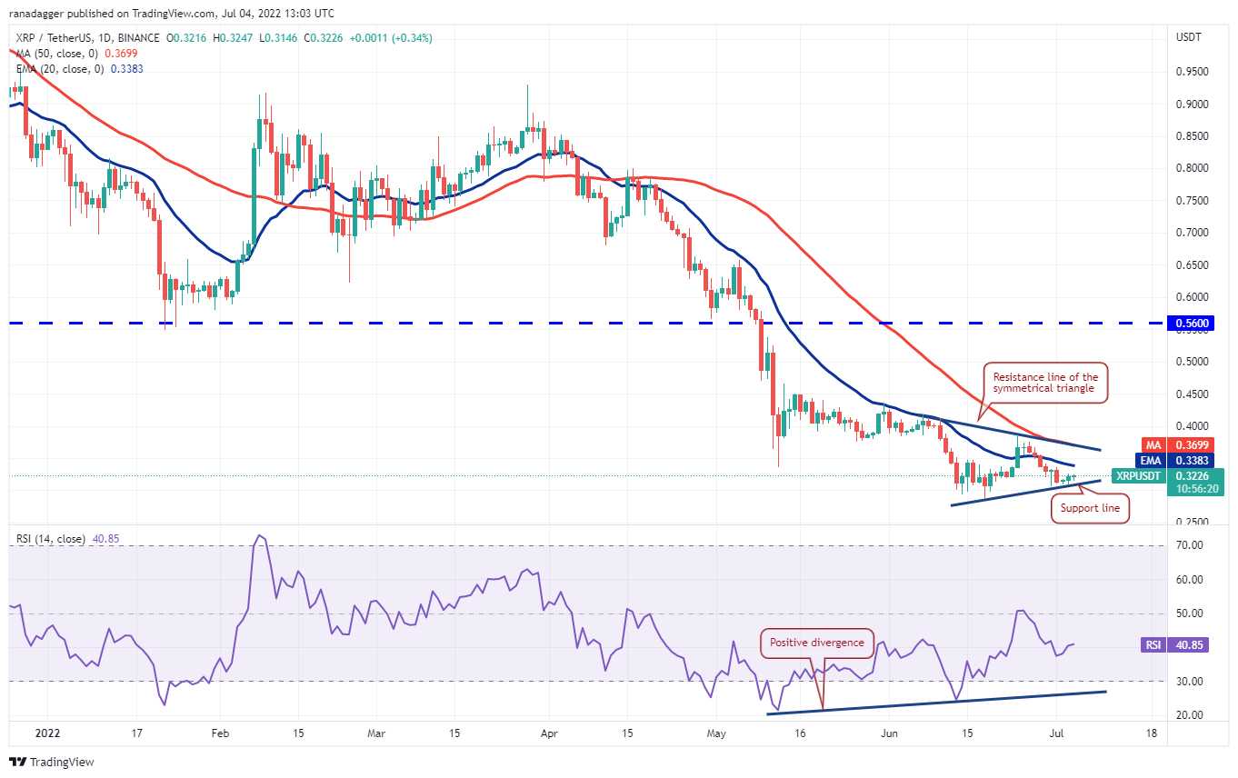 El precio ha rebotado en la línea de soporte del triángulo y los alcistas intentarán empujar el par XRP/USDT por encima de la EMA de 20 días (USD 0.33). Si lo consiguen, el par podría subir hasta la línea de resistencia del triángulo.