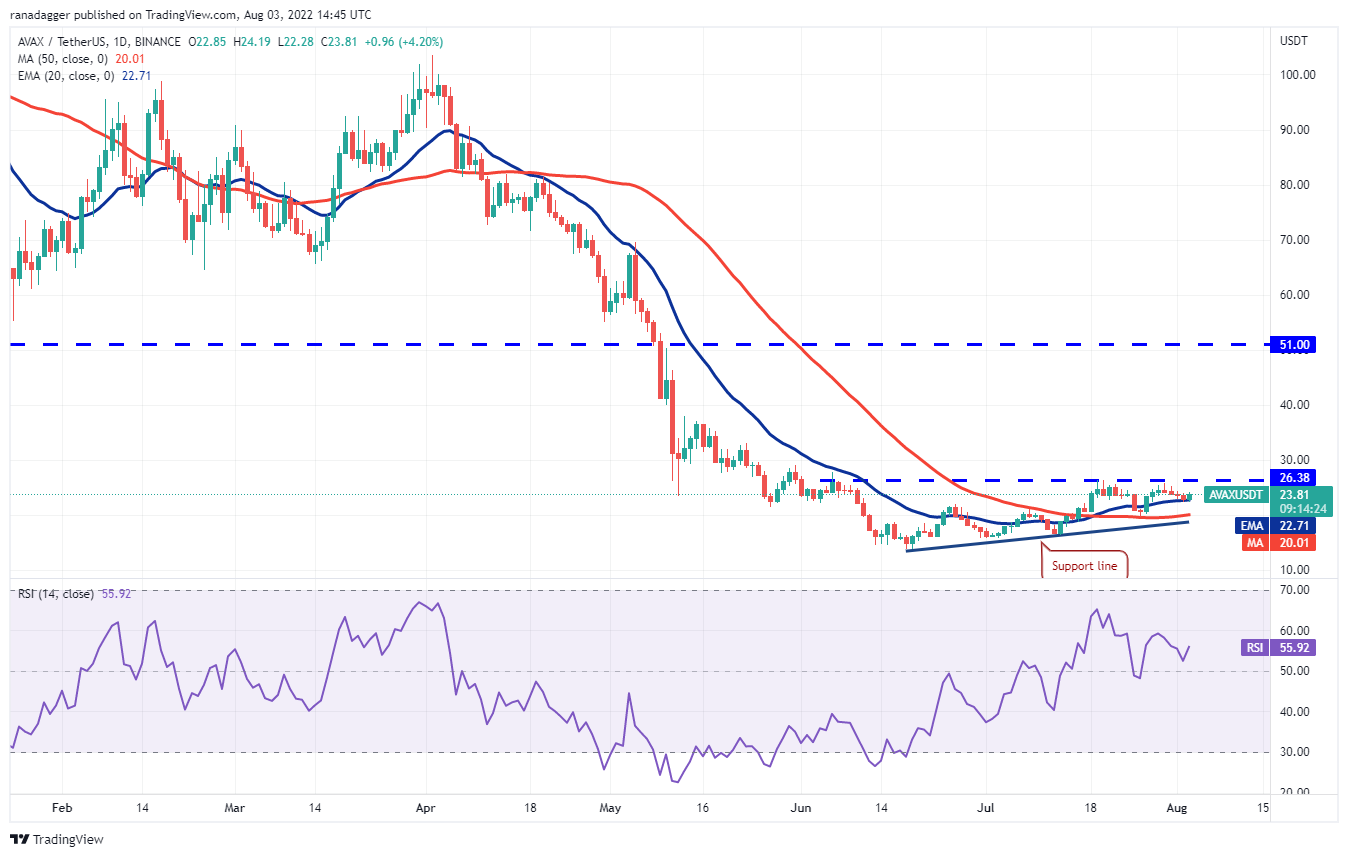 Los bajistas intentaron hundir a Avalanche (AVAX) por debajo de la EMA de 20 días (USD 22.71) el 2 de agosto, pero los alcistas se mantuvieron firmes. Esto indica que los traders están viendo las caídas como una oportunidad de compra.