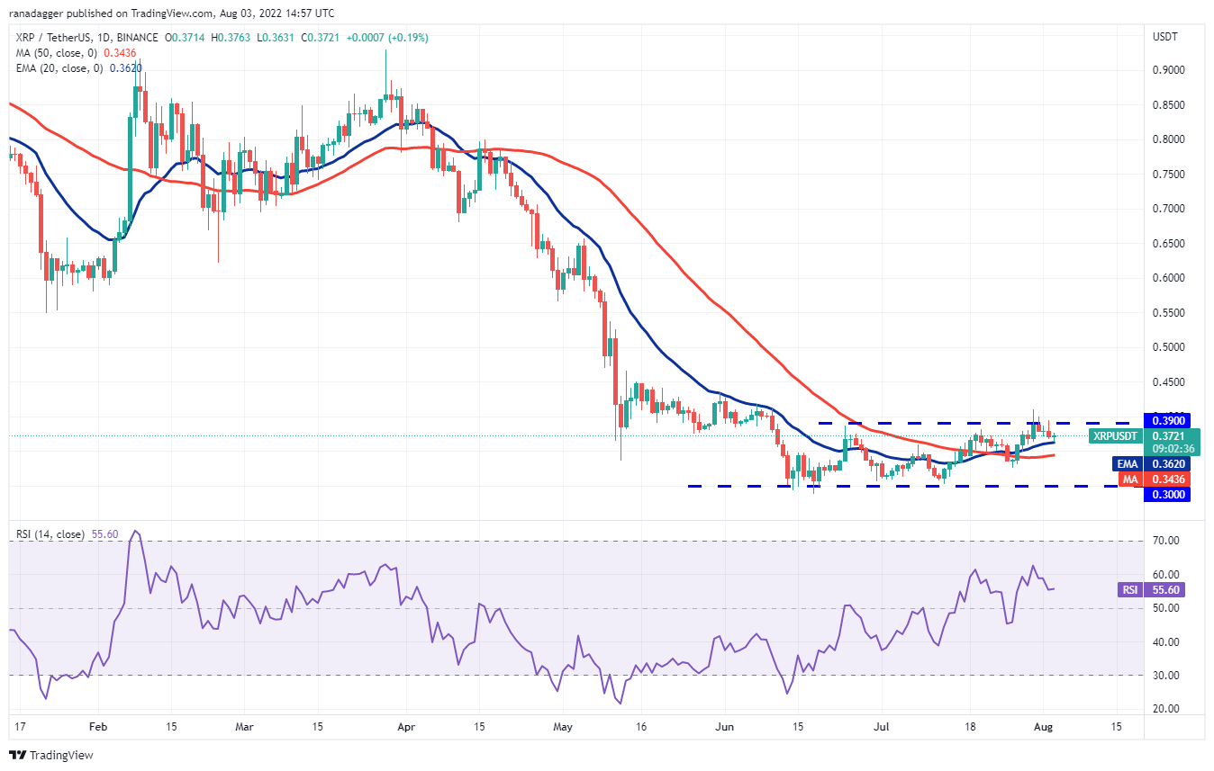 La larga cola de la vela del 3 de agosto de XRP indica que los alcistas están intentando defender la EMA de 20 días (USD 0.36). La EMA de 20 días gradualmente inclinada hacia arriba y el RSI en el territorio positivo indican una ligera ventaja para los compradores.