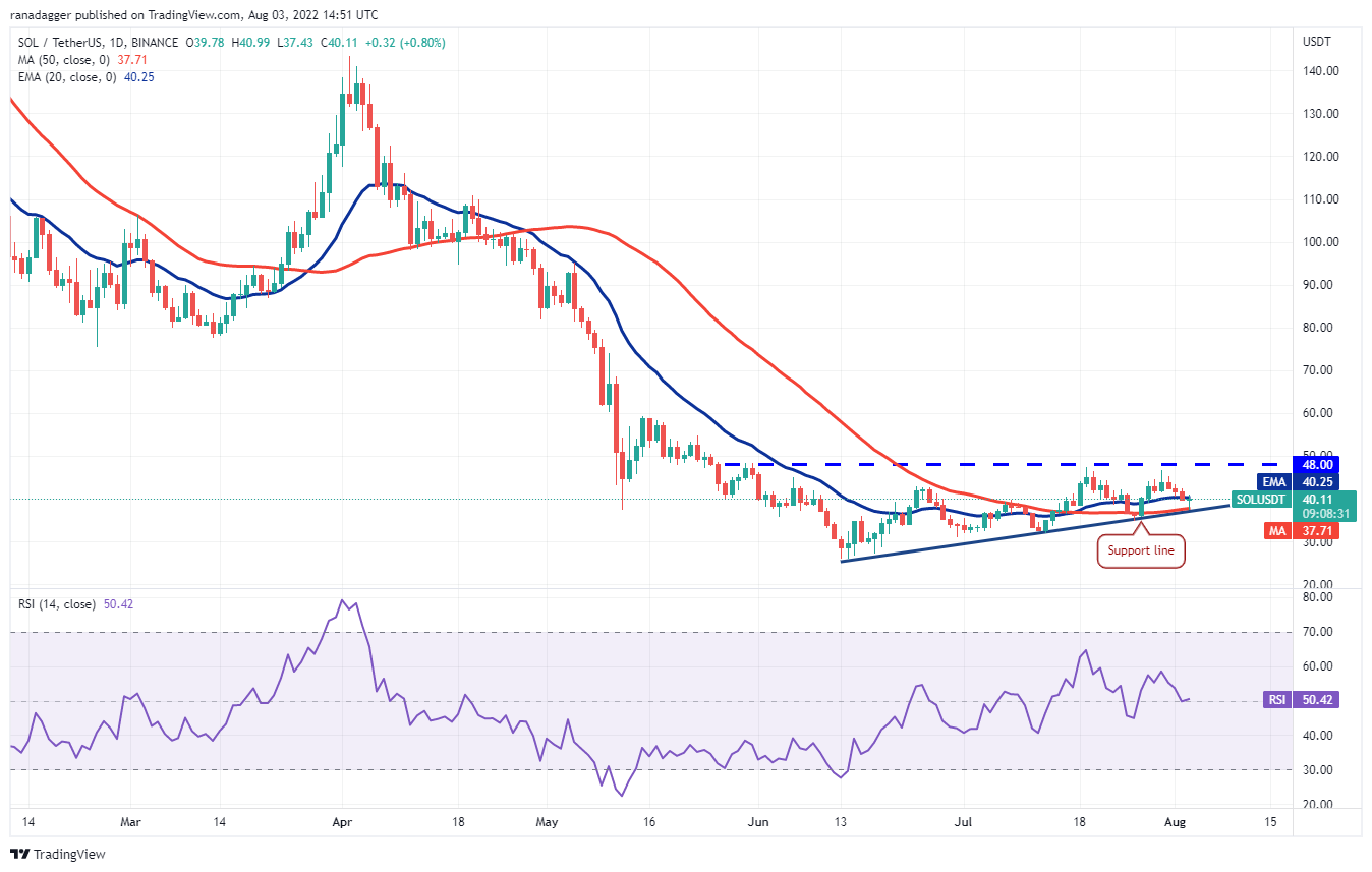 Solana (SOL) se sumergió por debajo de la EMA de 20 días (USD 40) el 2 de agosto y cayó hasta la SMA de 50 días (USD 37) el 3 de agosto. La larga cola de la vela sugiere que los traders están defendiendo la línea de soporte.
