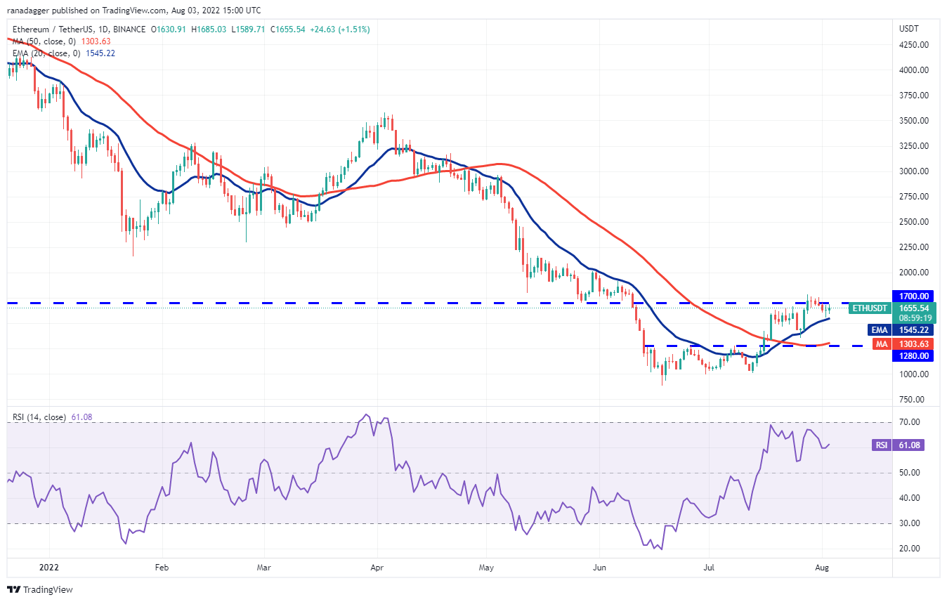 Ether (ETH) bajó y cayó a la EMA de 20 días (USD 1,545) el 2 de agosto, pero la larga cola de la vela sugiere que los alcistas compraron agresivamente la caída.