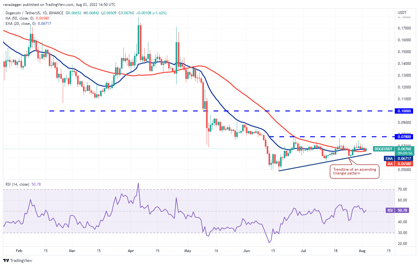 Los alcistas intentan detener el retroceso de Dogecoin (DOGE) en la SMA de 50 días (USD 0.07). Si el rebote se mantiene por encima de la EMA de 20 días (USD 0.07), es posible que vuelva a probar el nivel de USD 0.08.