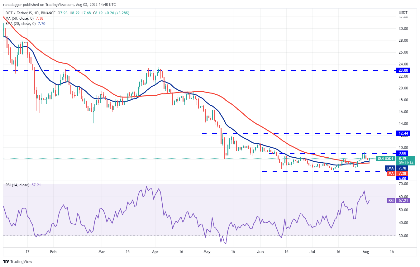 La EMA de 20 días, que se inclina gradualmente hacia arriba, y el RSI, en territorio positivo, indican que los alcistas tienen una ligera ventaja. Si los alcistas impulsan el precio por encima de la resistencia superior de USD 9, el par DOT/USDT podría subir a USD 10.80 y luego a USD 12.