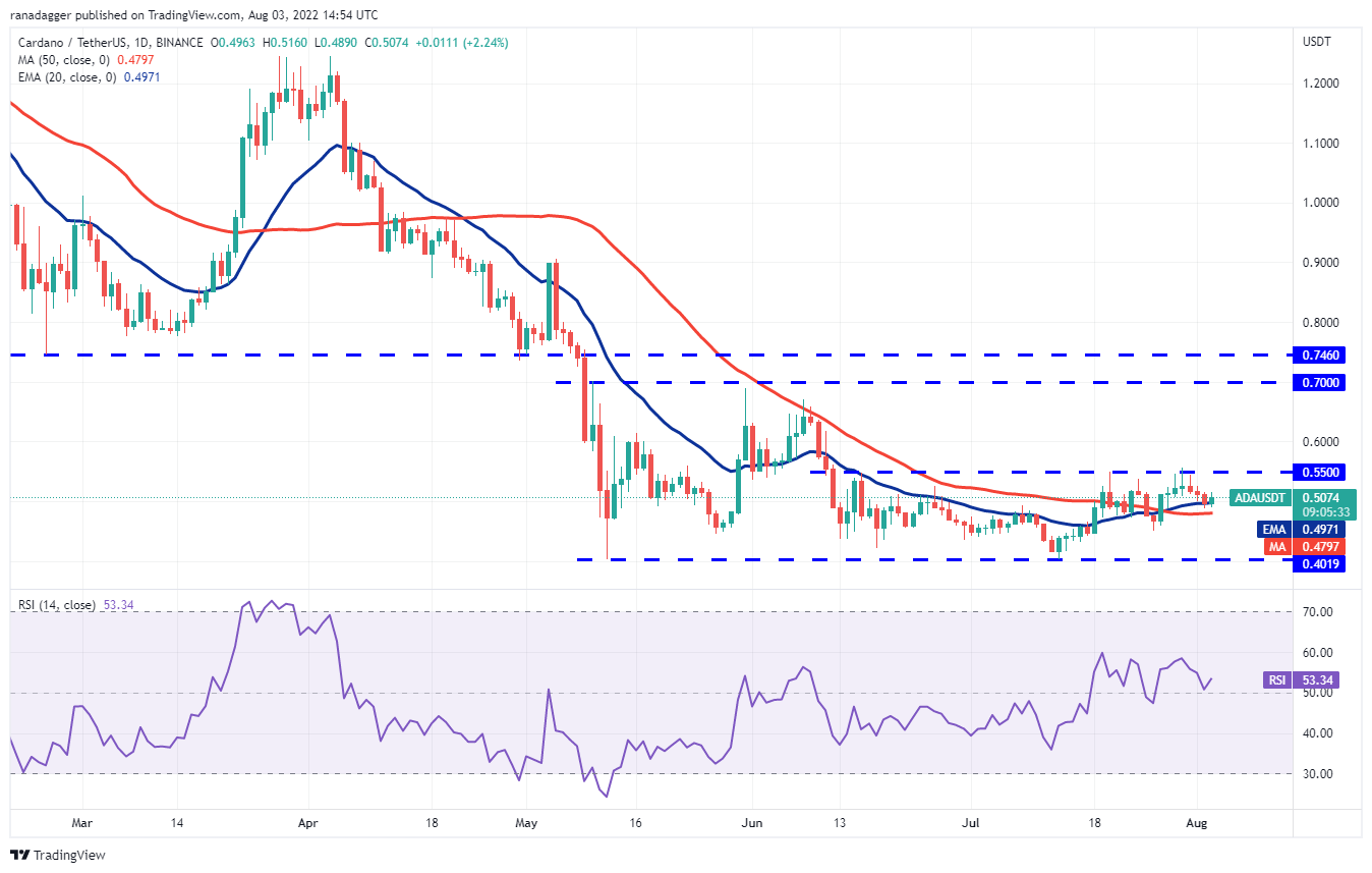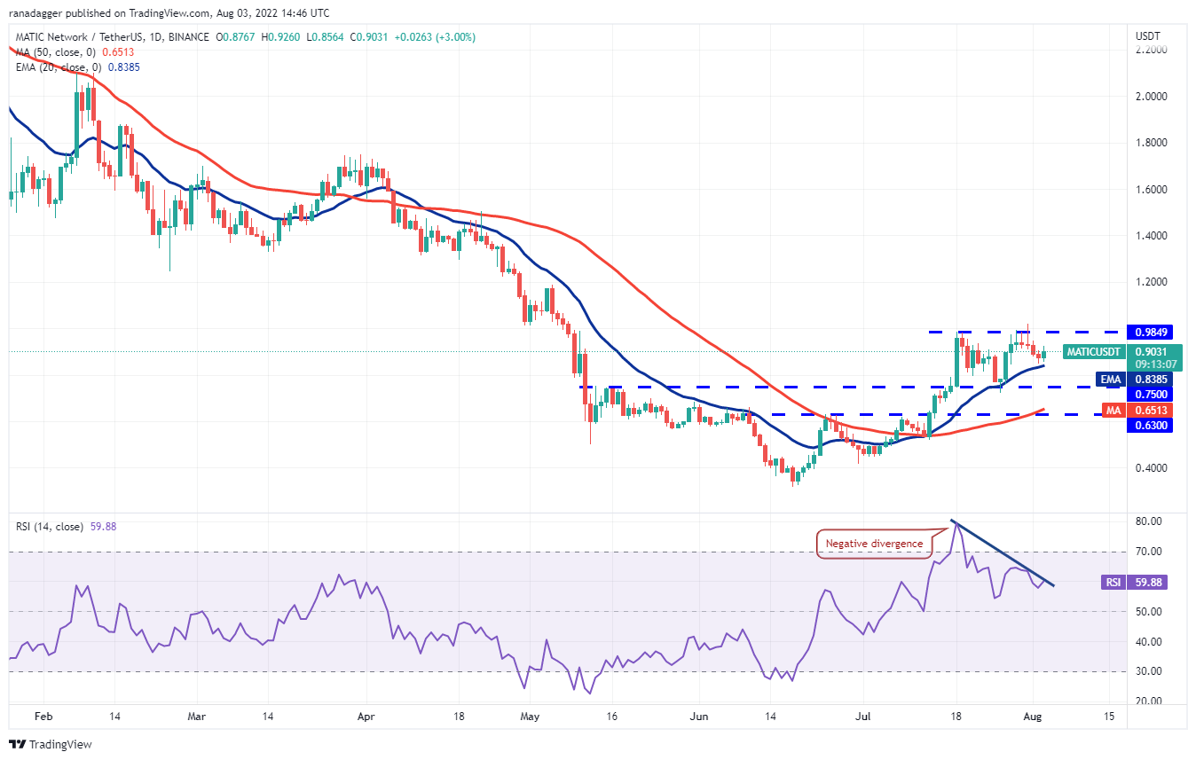 Polygon (MATIC) rebotó en la EMA de 20 días (USD 0.84) el 2 de agosto, lo que indica que los alcistas están comprando en las caídas. El precio podría volver a probar la zona de resistencia superior de USD 0.98 a USD 1.01.