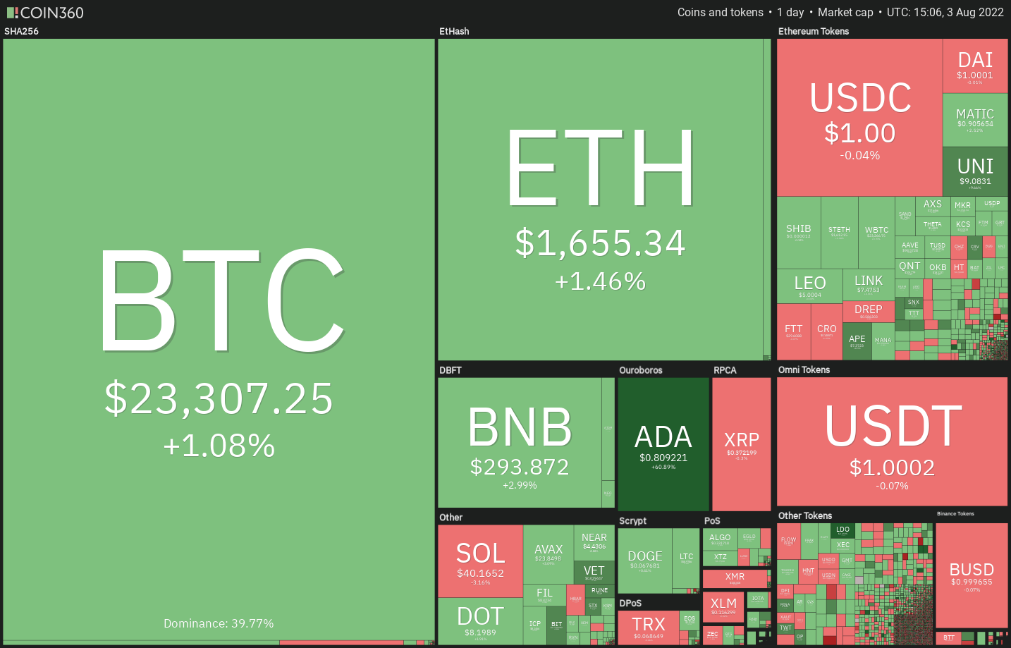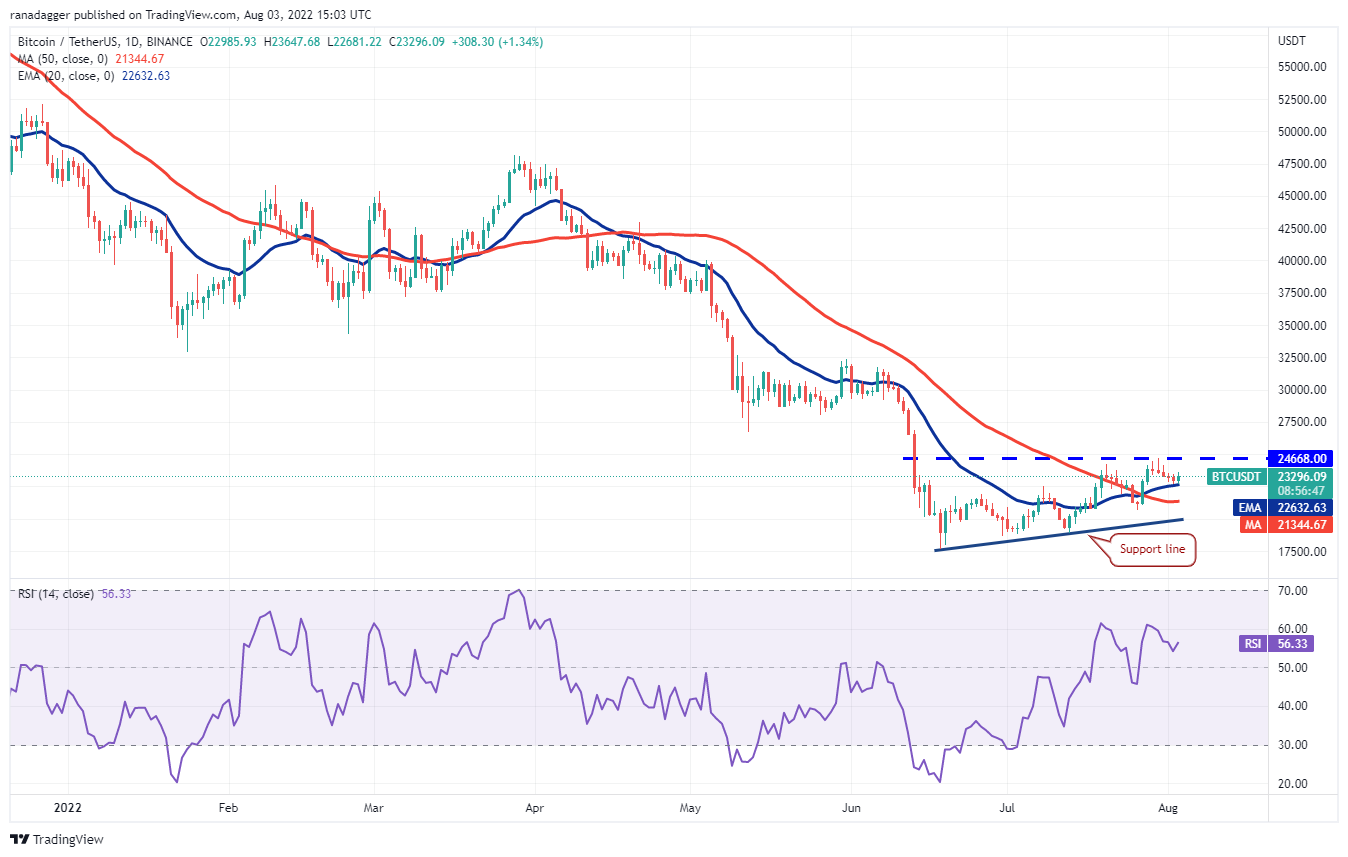 Bitcoin cayó hasta la media exponencial móvil de 20 días (USD 22,632) el 2 de agosto, que está actuando como fuerte soporte. La EMA de 20 días, que se inclina gradualmente hacia arriba, y el índice de fuerza relativa (RSI) en territorio positivo sugieren que los alcistas tienen una ligera ventaja.