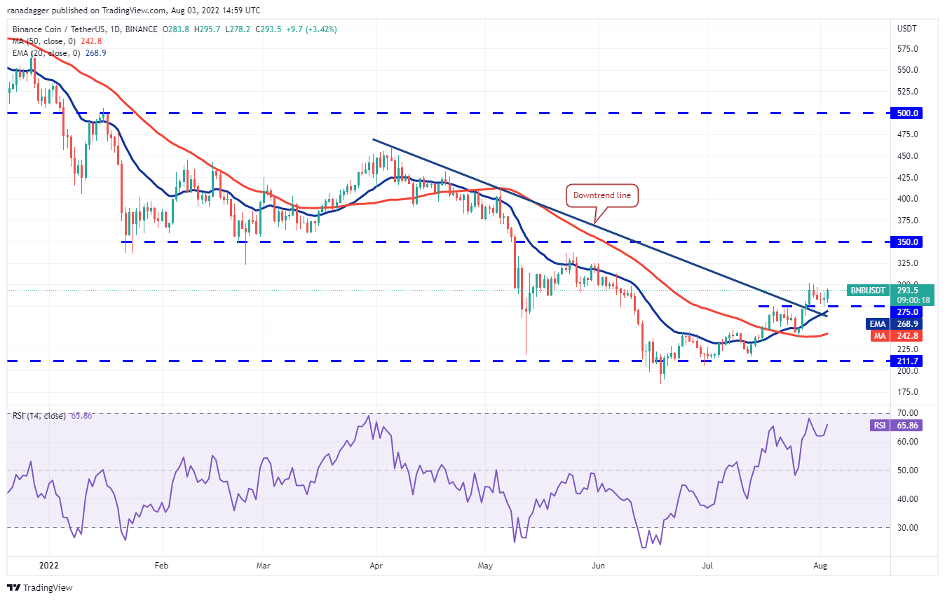 Binance Coin (BNB) rebotó en el soporte de USD 275 el 2 de agosto, lo que indica que el sentimiento se ha vuelto positivo y los traders están comprando en las caídas.
