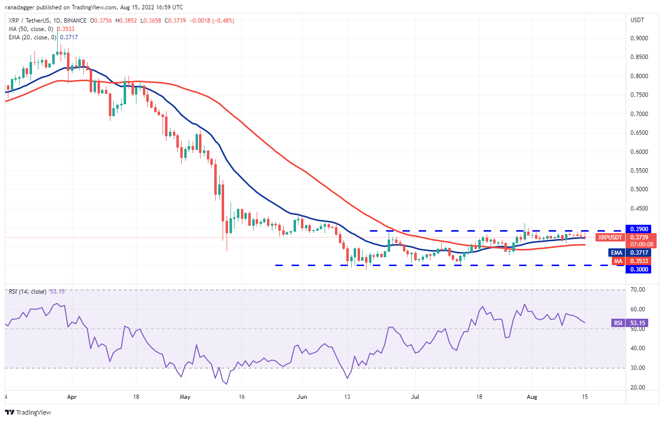 Los alcistas trataron de empujar a XRP por encima de la resistencia superior de USD 0.39 el 13 y 14 de agosto, pero los bajistas se mantuvieron firmes. Esto puede haber atraído la toma de beneficios de los traders a corto plazo, lo que llevó al precio por debajo de la EMA de 20 días (USD 0.37).