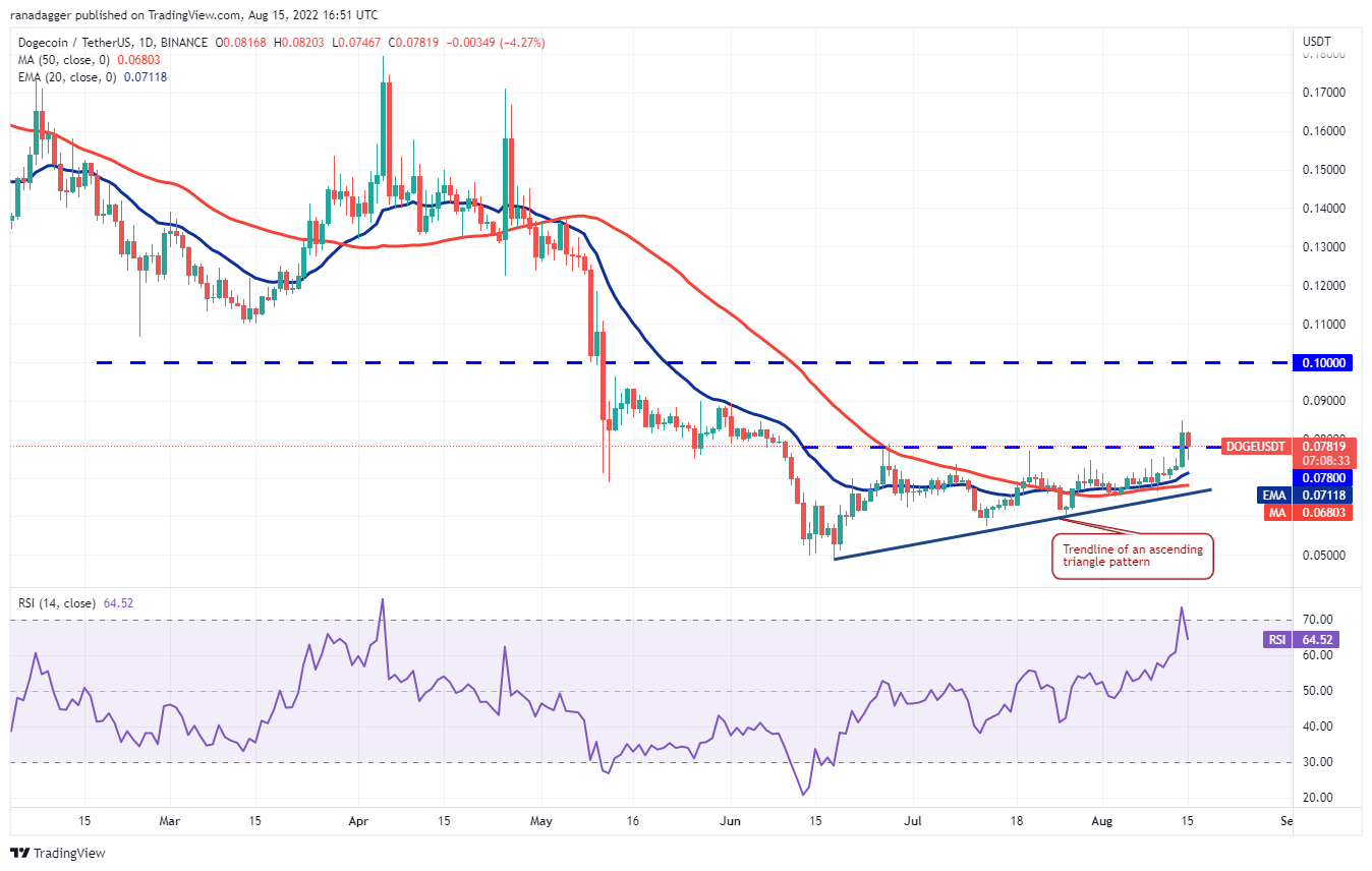 Dogecoin (DOGE) rebotó en la EMA de 20 días (USD 0.07) el 12 de agosto y superó la resistencia superior de USD 0.08 el 14 de agosto. Esto completó el patrón de triángulo ascendente alcista, pero los alcistas no pudieron mantener la ruptura.