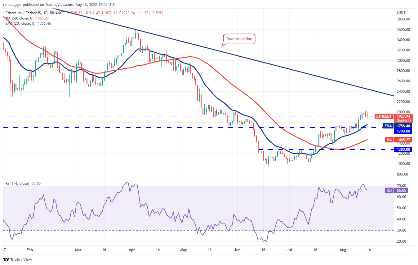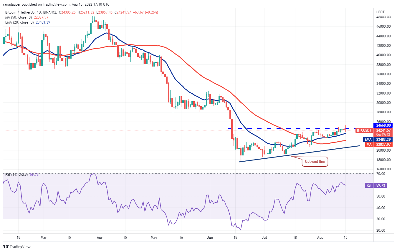 Los alcistas trataron de reanudar el movimiento alcista en Bitcoin, pero los bajistas vendieron agresivamente a USD 25,211 y tiraron del precio hasta la media móvil exponencial de 20 días (EMA) (USD 23,483). Esto dio lugar a la formación de un patrón de velas de día exterior el 15 de agosto.