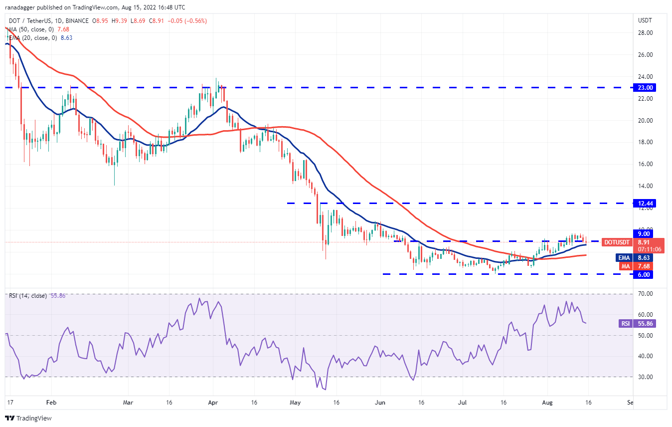 El par DOT/USDT cayó por debajo del nivel de ruptura de USD 9 el 14 de agosto y el precio alcanzó la EMA de 20 días (USD 8.63) el 15 de agosto. Este es un nivel importante a tener en cuenta porque una ruptura por debajo de él podría sugerir que el impulso alcista se ha debilitado. El par podría caer hasta la EMA de 50 días (USD 7.68) y permanecer en el rango durante algún tiempo.