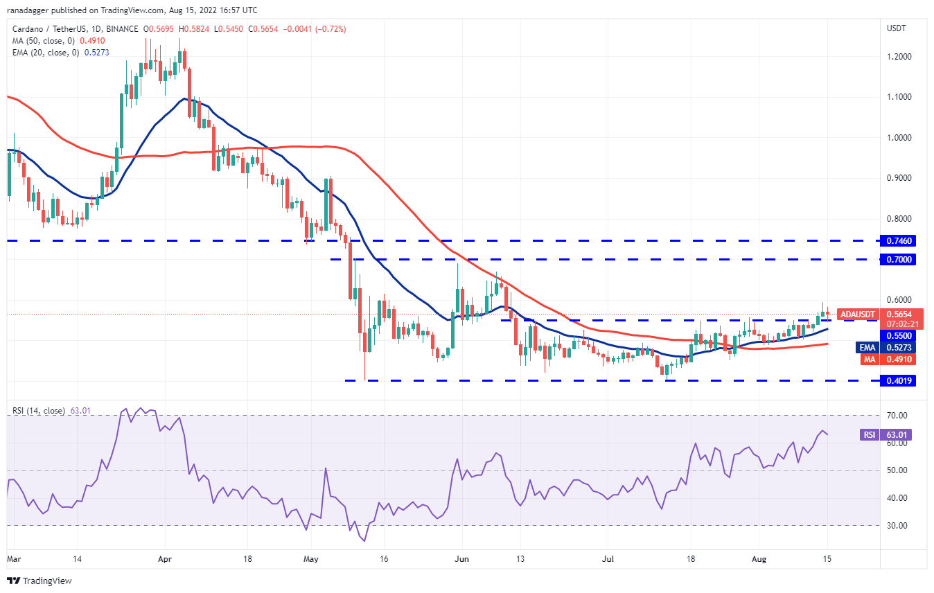 El precio bajó el 15 de agosto y alcanzó el nivel de ruptura de USD 0.55. La zona entre USD 0.55 y la EMA de 20 días (USD 0.53) es probable que atraiga fuertes compras por parte de los bajistas. Si el precio rebota en esta zona, los compradores intentarán de nuevo reanudar el movimiento alcista y empujar el par ADA/USDT a USD 0.63 y luego a USD 0.70.
