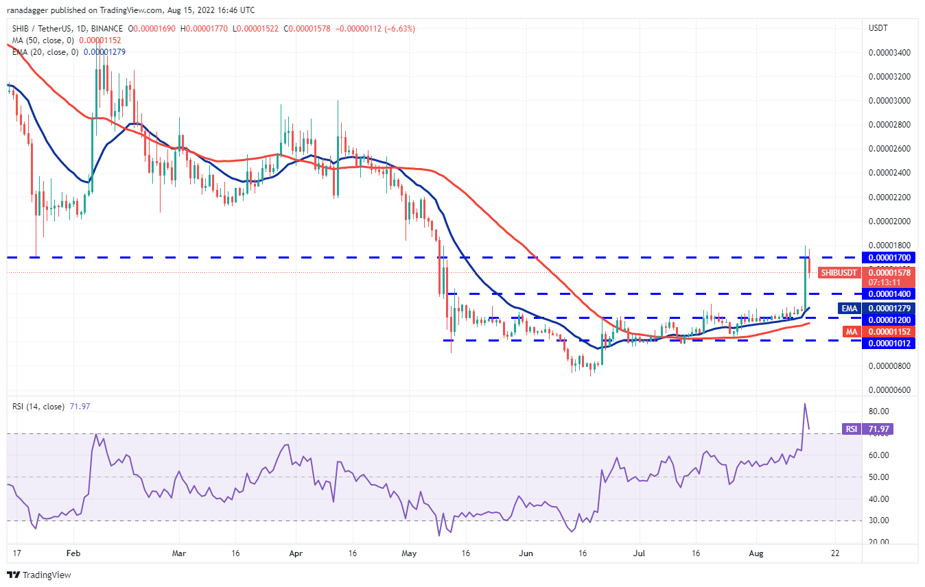 Shiba Inu (SHIB) ha estado cotizando por encima de USD 0.000012 desde el 7 de agosto, pero el movimiento alcista no había conseguido coger impulso. Esto cambió con el fuerte repunte del 14 de agosto, que hizo que el precio superara la resistencia superior de USD 0.000017.