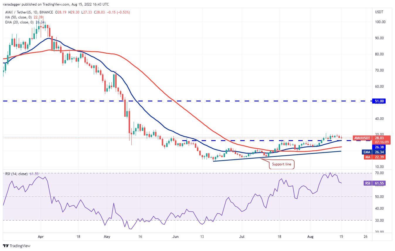 Los compradores trataron de empujar a Avalanche (AVAX) por encima de la resistencia superior el 13 de agosto, pero los bajistas detuvieron el intento en USD 30.35. Esto sugiere que los bajistas están activos en niveles más altos.