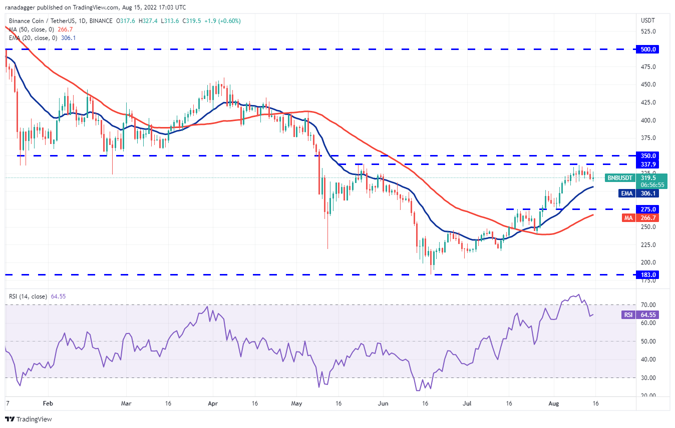 El movimiento alcista del BNB se topó con un obstáculo en la resistencia superior de USD 338. Los bajistas intentarán ahora hundir el precio hasta el soporte inmediato de la EMA de 20 días (USD 306).