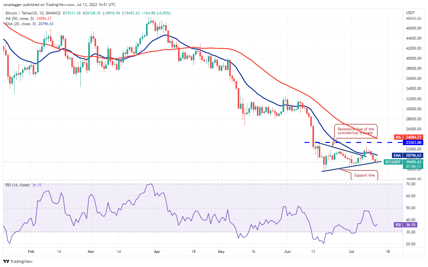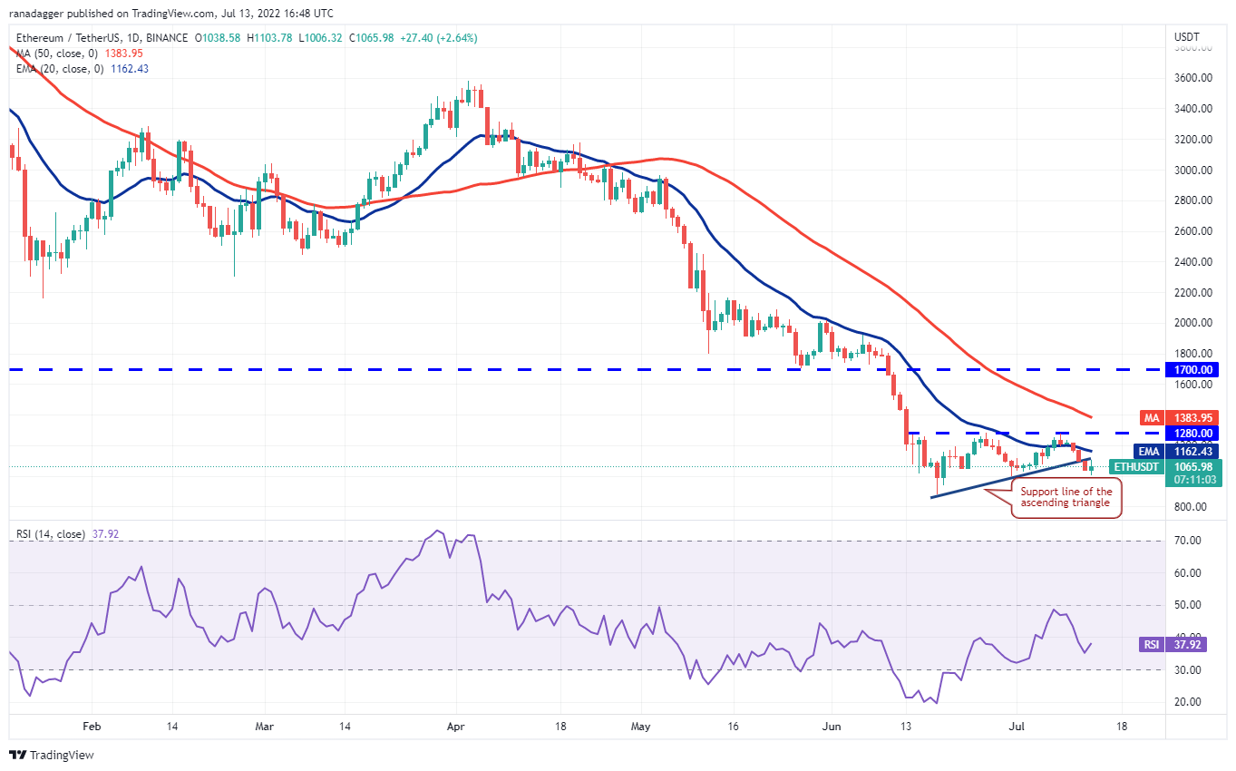 Ether (ETH) rompió por debajo de la línea de soporte del patrón de triángulo ascendente el 12 de julio, lo que invalidó la configuración alcista. Un pequeño aspecto positivo es que los alcistas están tratando de hacer que el precio entre de nuevo en el triángulo.