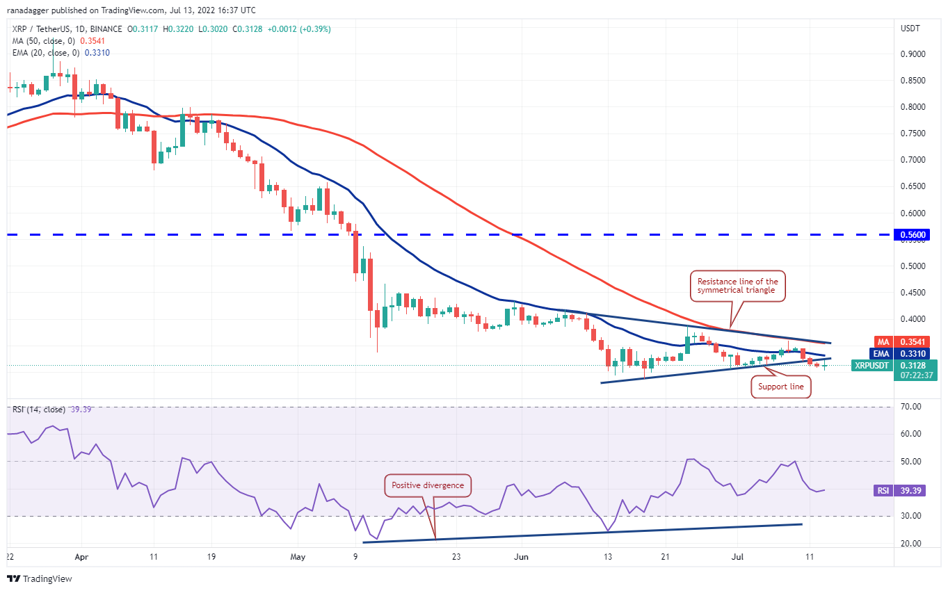 Los alcistas trataron de que el precio entrara de nuevo en el triángulo el 13 de julio, pero la mecha larga en la vela sugiere que los bajistas están vendiendo en pequeños repuntes intradía. Si el precio rompe por debajo de USD 0.30, el par XRP/USDT podría caer hasta el soporte crucial de USD 0.28. Una ruptura y cierre por debajo de este nivel podría señalar el inicio del siguiente tramo de la tendencia bajista.