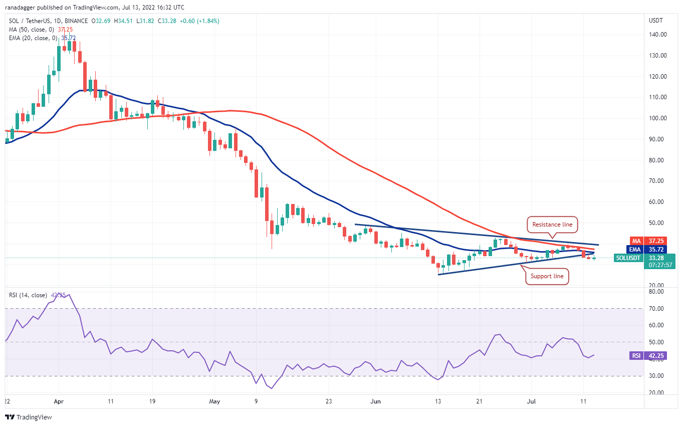 Los compradores están intentando defender el nivel, pero la mecha larga de la vela del 13 de julio muestra que los bajistas están vendiendo cerca de la media móvil exponencial de 20 días (USD 20,796). Ambas medias móviles están inclinadas hacia abajo y el índice de fuerza relativa (RSI) está en la zona negativa, lo que indica que los bajistas están al mando.