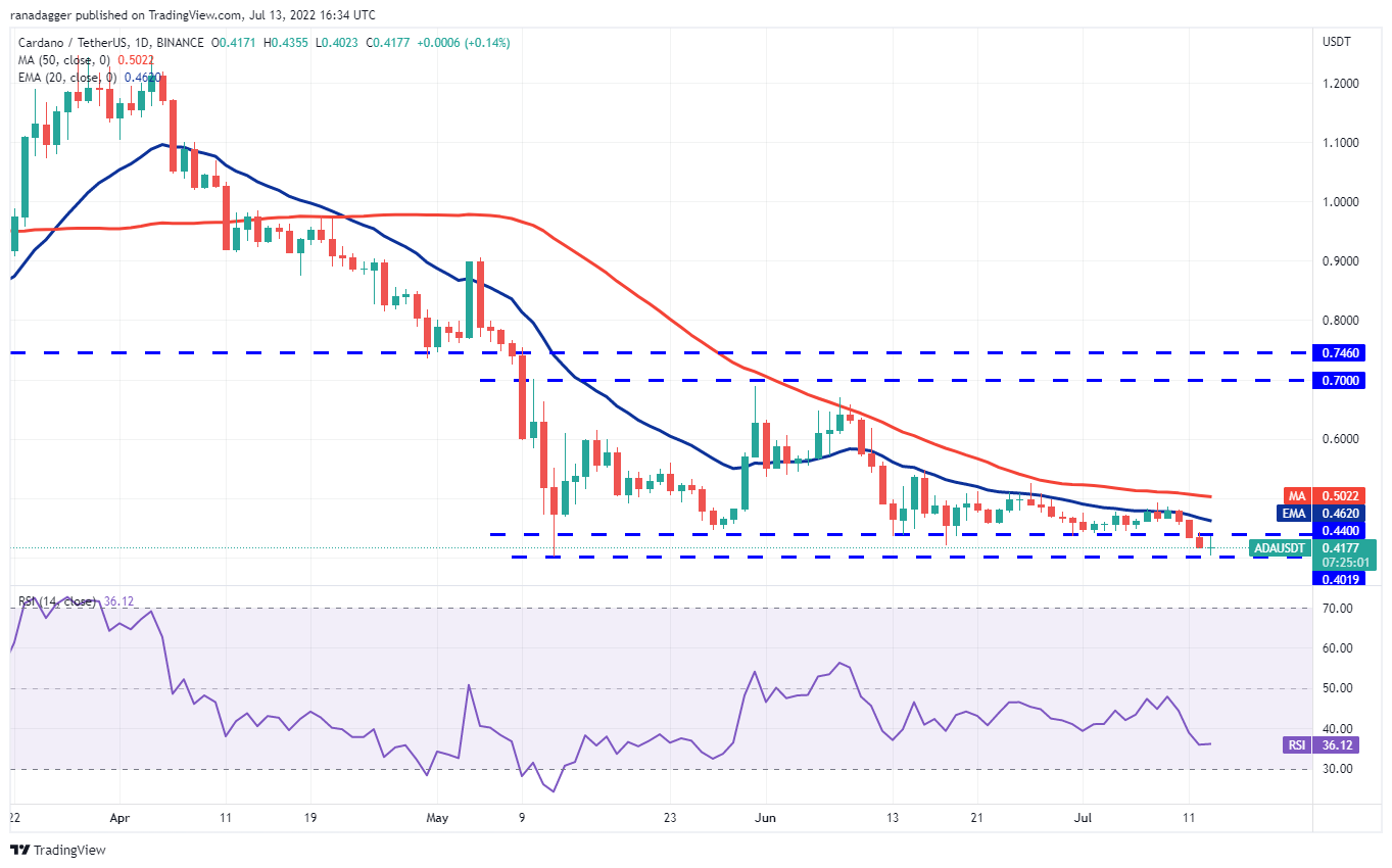 Cardano (ADA) cayó por debajo del soporte inmediato de USD 0.44 el 11 de julio, lo que indica que los bajistas están al mando. La venta continuó y los bajistas arrastraron el precio hasta el soporte de USD 0.40.