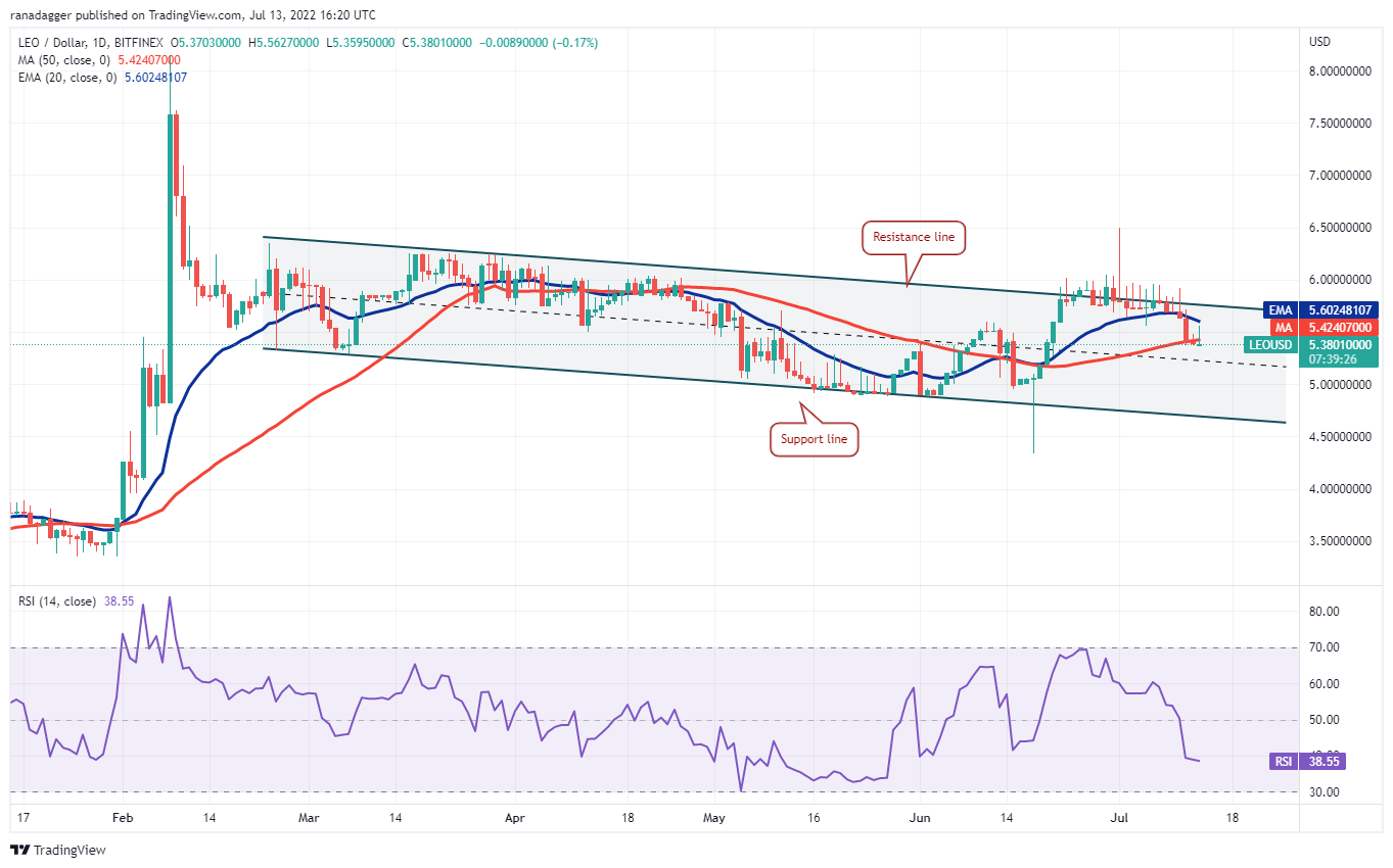 El precio bajó desde los USD 5.91 el 10 de julio y se desplomó por debajo de la EMA de 20 días (USD 5.60). A esto le siguieron más ventas que llevaron al precio por debajo de la EMA de 50 días (USD 5.42) el 12 de julio. Si los bajistas mantienen el precio por debajo de la EMA de 50 días, el par LEO/USD podría caer hasta la línea de soporte del canal descendente.