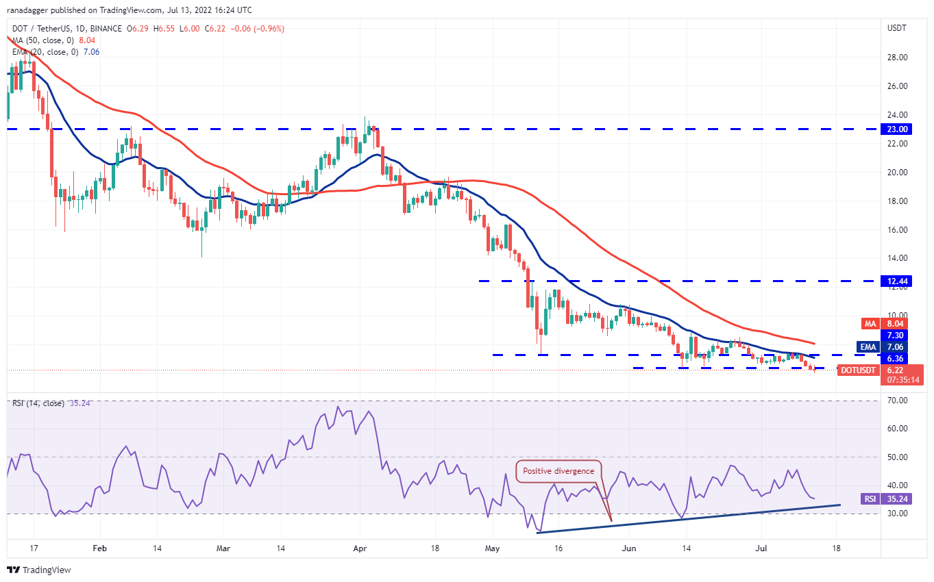 Polkadot (DOT) rompió y cerró por debajo del soporte crucial de USD 6.36 el 12 de julio, lo que indica una venta agresiva por parte de los bajistas. Un pequeño aspecto positivo es que el RSI ha mantenido la divergencia positiva, lo que indica que el impulso bajista puede estar terminando.