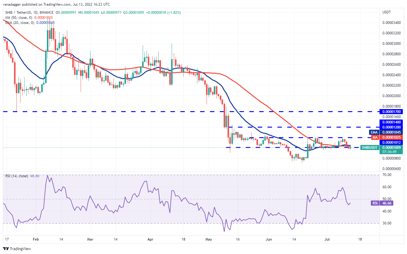 Shiba Inu (SHIB) cayó por debajo del nivel psicológico de USD 0.000010 el 12 de julio, lo que indica una fuerte venta por parte de los bajistas. Un aspecto positivo es que los alcistas compraron durante la caída y están intentando sostener el precio por encima de USD 0.000010.