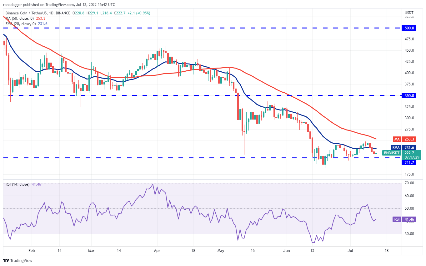 El par BNB/USDT intentó un rebote desde el fuerte soporte de USD 211 el 13 de julio, pero la mecha larga de la vela muestra que los bajistas están vendiendo cerca de la EMA de 20 días. Si el precio rompe por debajo de los USD 211, la venta podría intensificarse y el par podría deslizarse hasta el soporte de los USD 183.