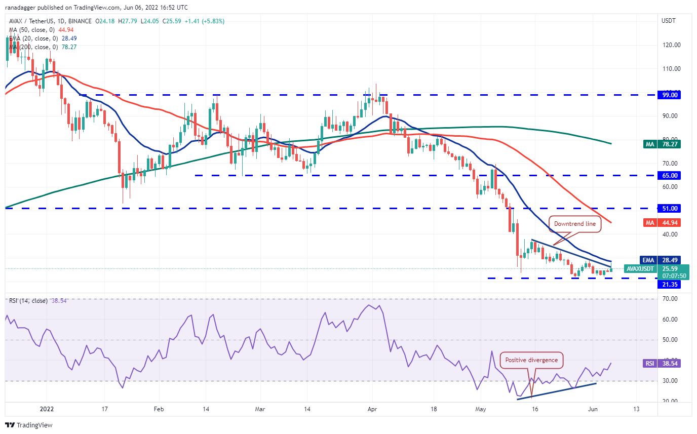 Avalanche (AVAX) rebotó en USD 22.14 el 4 de junio, lo que indica que los alcistas están defendiendo con vigor el soporte de USD 21.35. Los compradores han empujado el precio por encima de la línea de tendencia bajista y están intentando superar el obstáculo general en la EMA de 20 días (USD 28).
