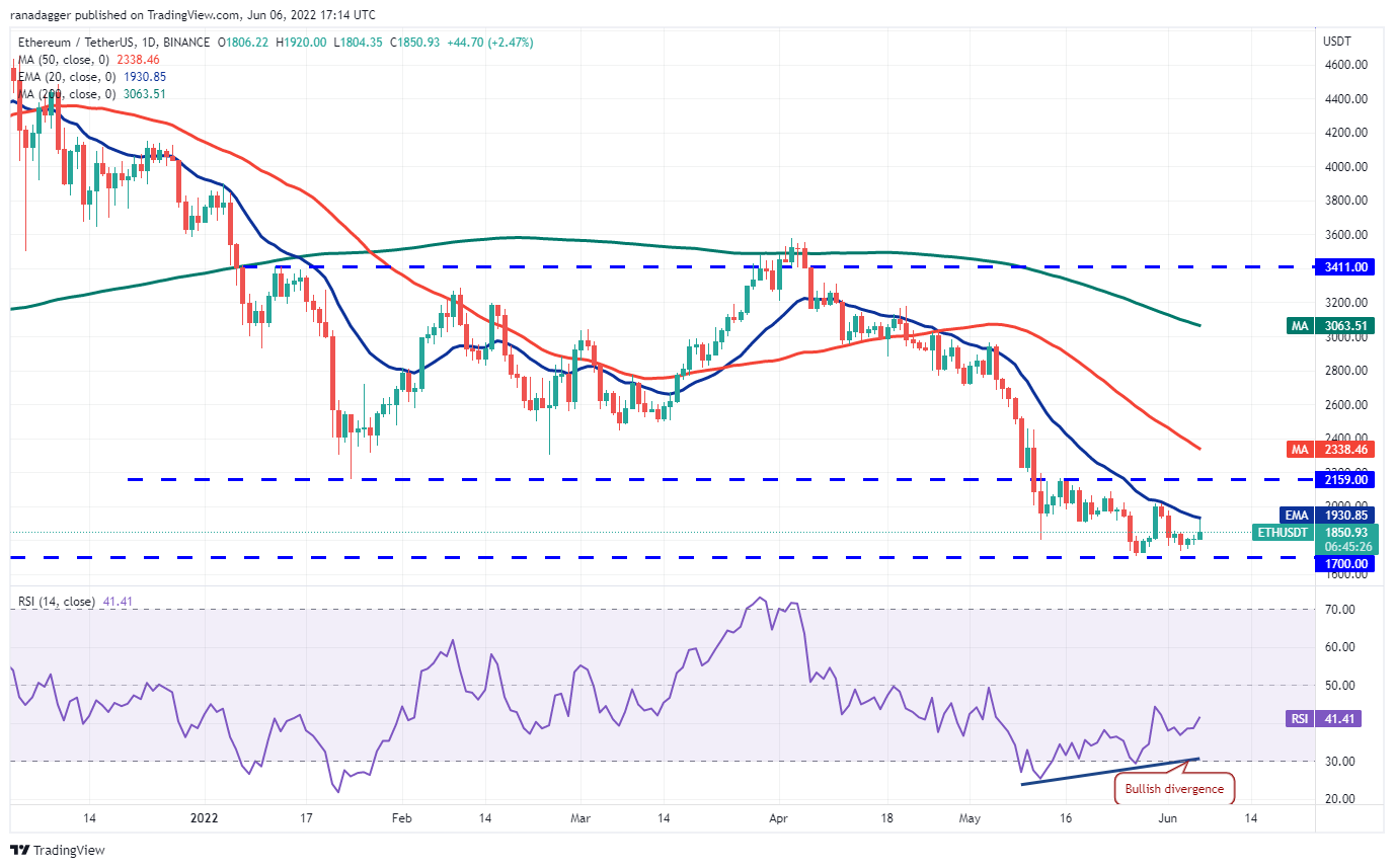 Ether (ETH) rebotó en USD 1737 el 3 de junio, lo que indica que los alcistas están intentando defender el soporte crucial de USD 1700. Los compradores están intentando empujar el precio por encima de la resistencia superior en la EMA de 20 días (USD 1930) el 6 de junio.