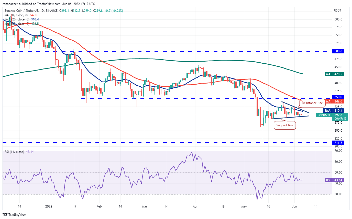 Si el precio baja desde la resistencia superior, los bajistas volverán a intentar tirar del par BNB/USDT por debajo de la línea de soporte. Si logran hacer eso, el par podría caer a USD 265 donde puede surgir una compra.